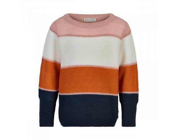 Minymo strikbluse i fire flotte farver og med en smal rosa stribe som adskillelse. Strikketrøjen har ribkanter i alle åbninger. Ved håndled ekstra lang smart rib. En pullover der er dejlig at have på og som er lavet i en let strikkvalitet.