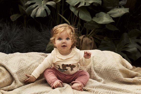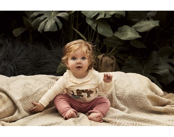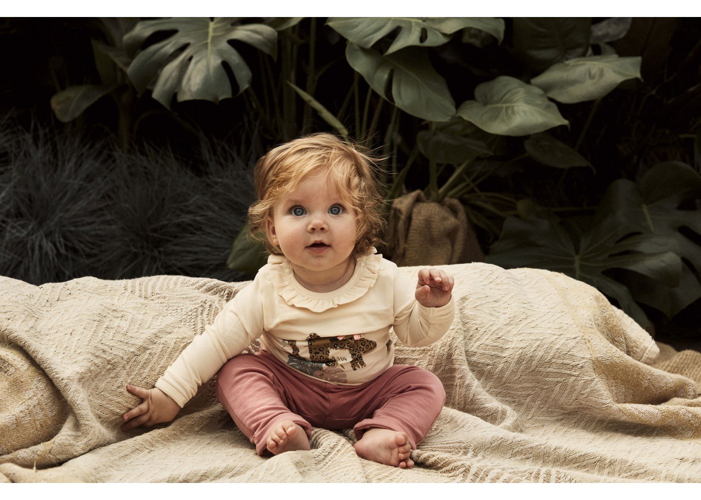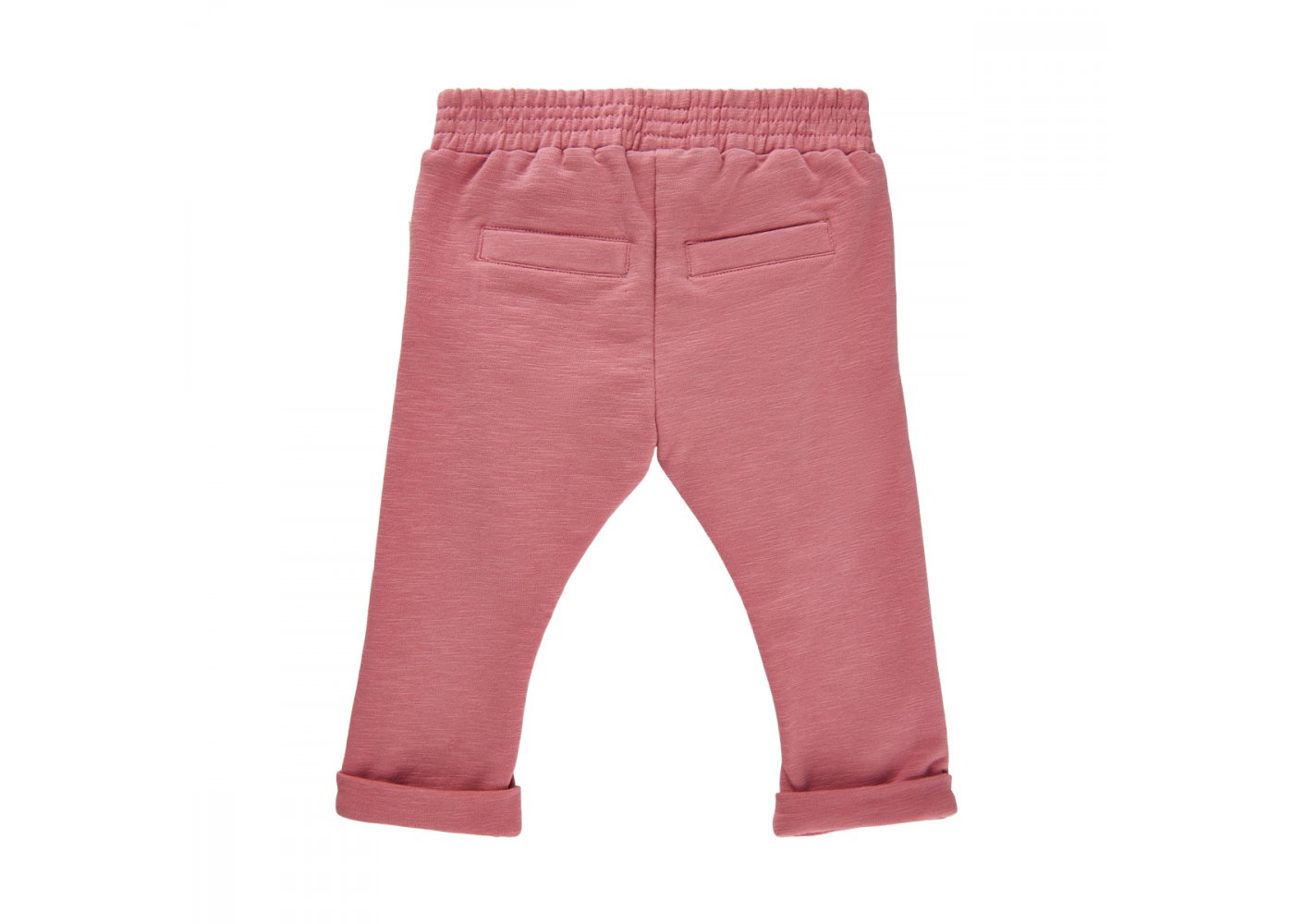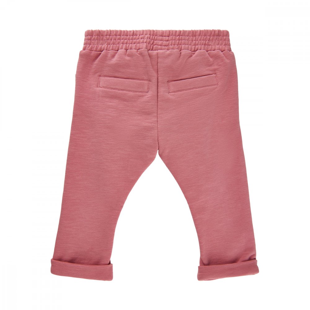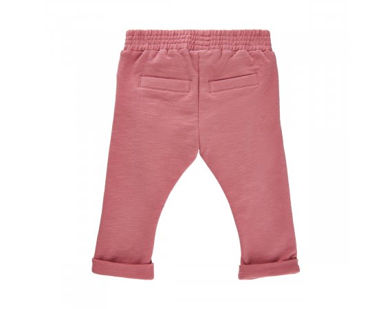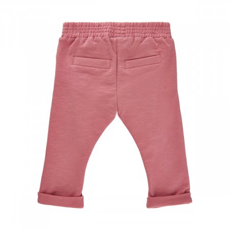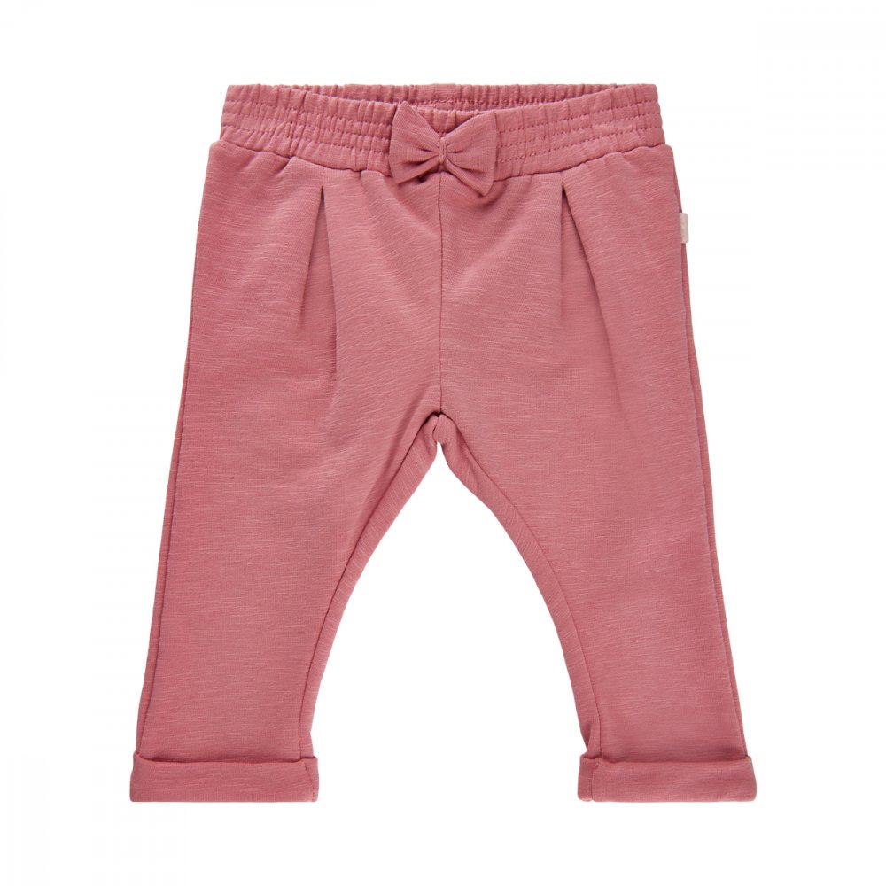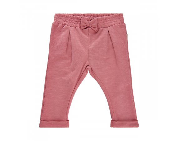 Buksen er i ensfarvet rosa med læg og en sød sløjfe foran og opsmøg ved ankler. Den har en bred rib i livet, der sikrer en god pasform. Buksen er lavet i en lækker økologisk bomuld.