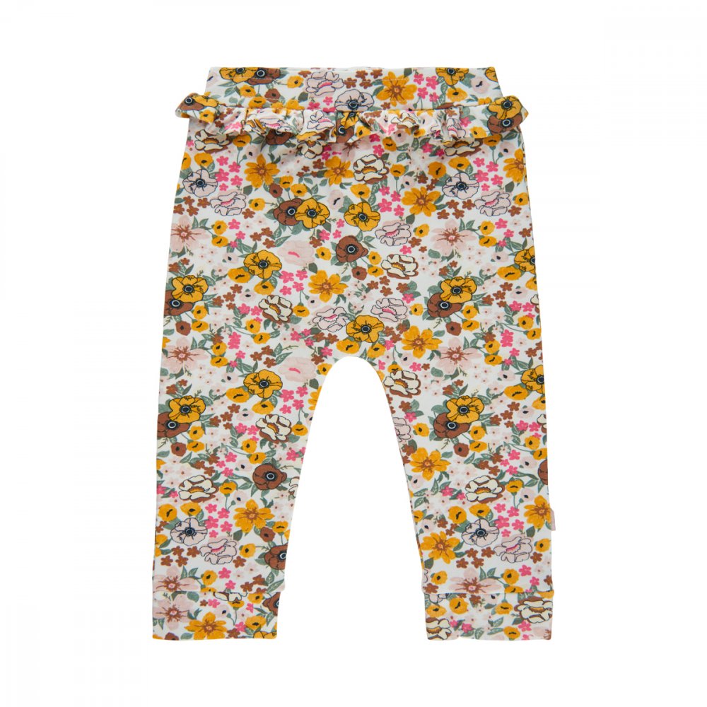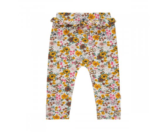 Lækre hvide bukser fyldt med gule, grønne, brune og rosa blomster fra Minymo. Buksen har en fin flæse og elastik i talje og er fremstillet i en skøn, strækbar bomuld, der gør den behagelig at have på.Tekstil: 95% økologisk bomuld, 5% elasthan GOTS-certificeret og STANDARD 100 by OEKO-TEX® godkendt