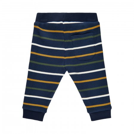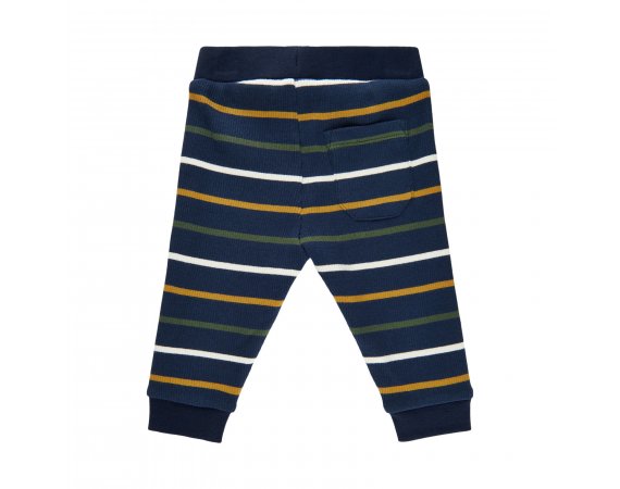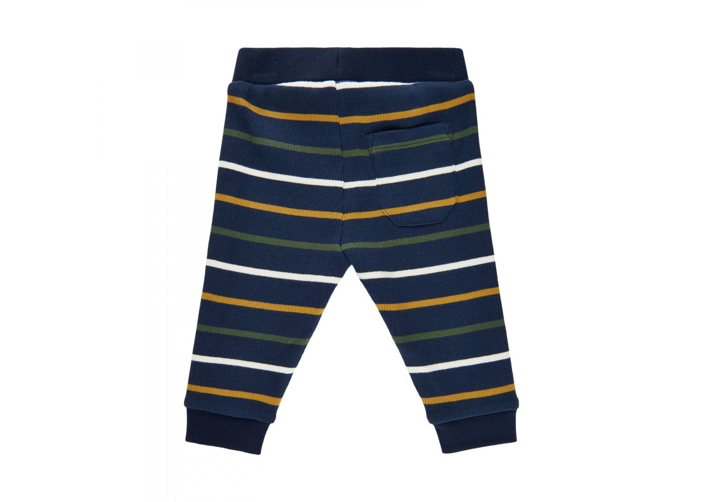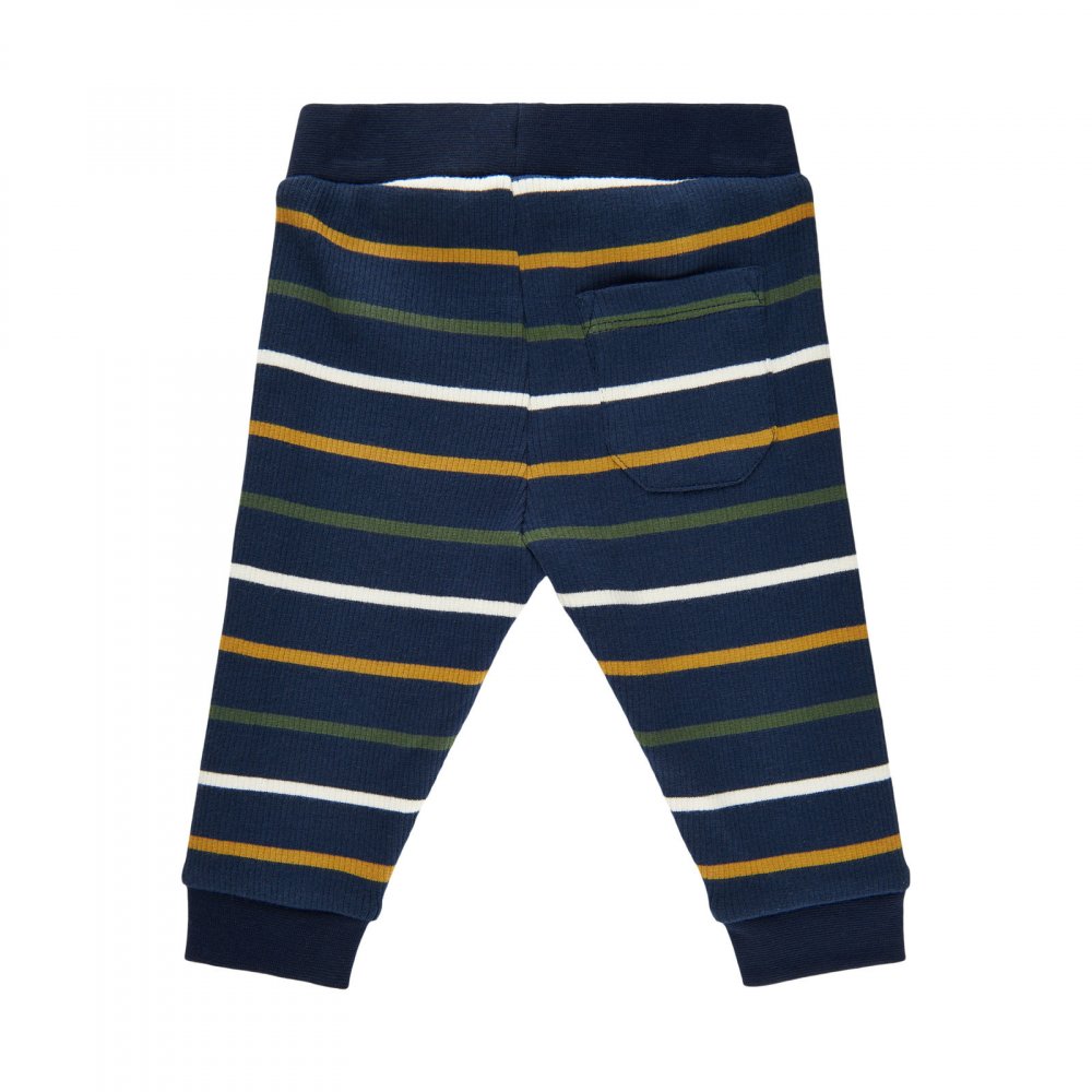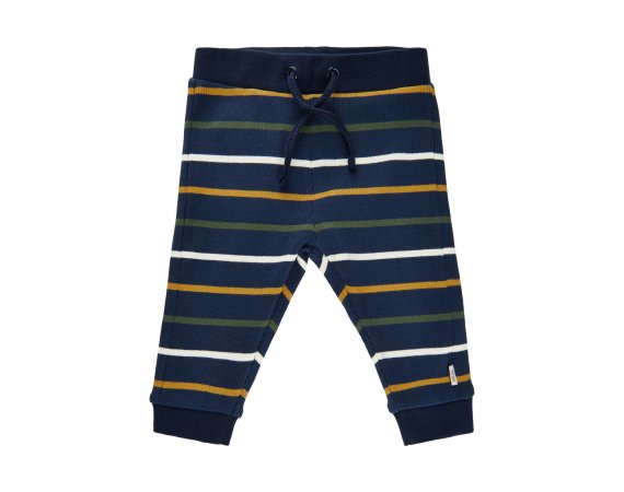 Søde bukser i blå med smalle striber i hvid, gul og grøn fra Minymo.