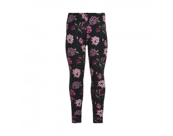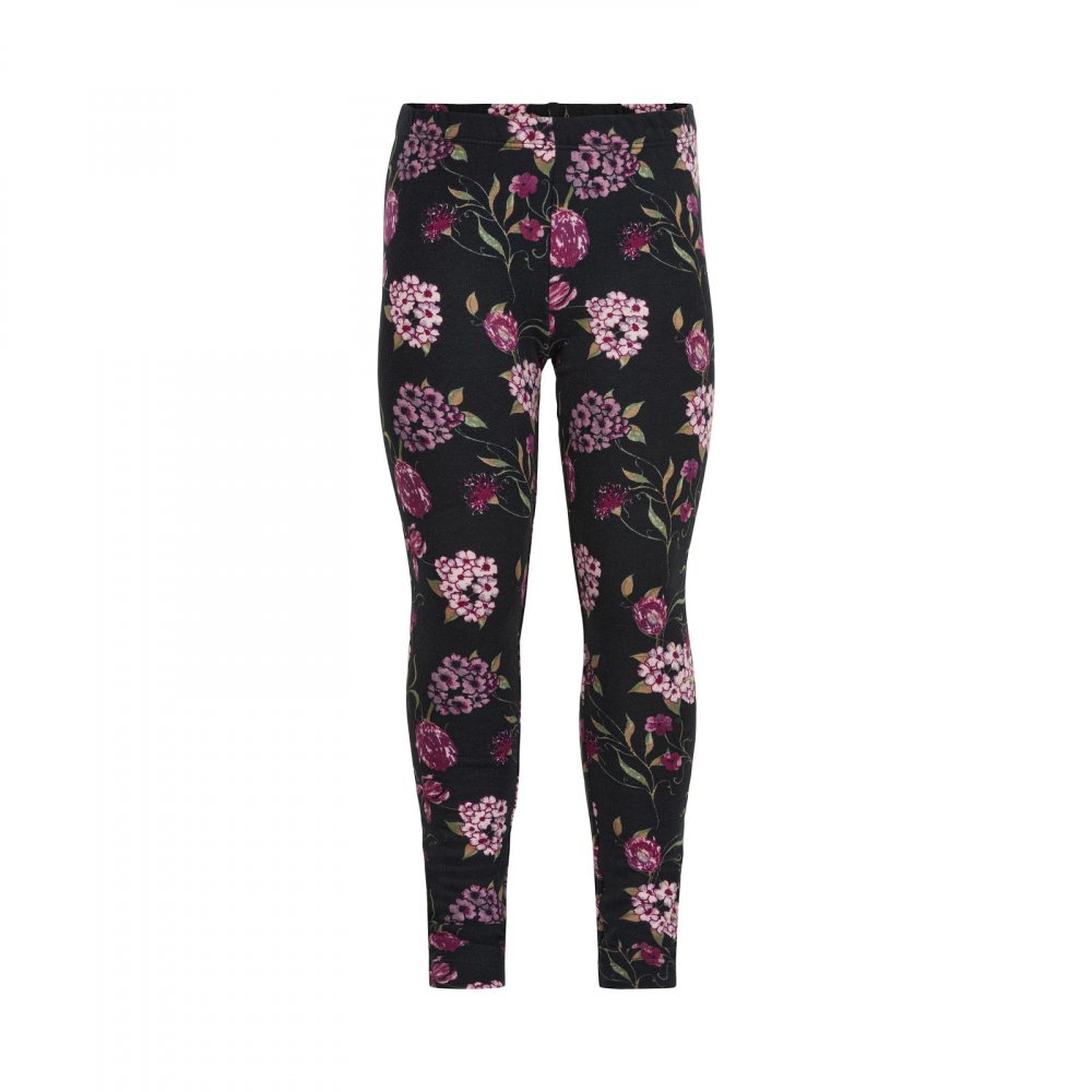 Smarte leggings i sort med flotte blomsterranker i rosa nuancer og grønne blade.