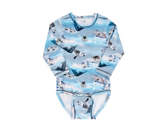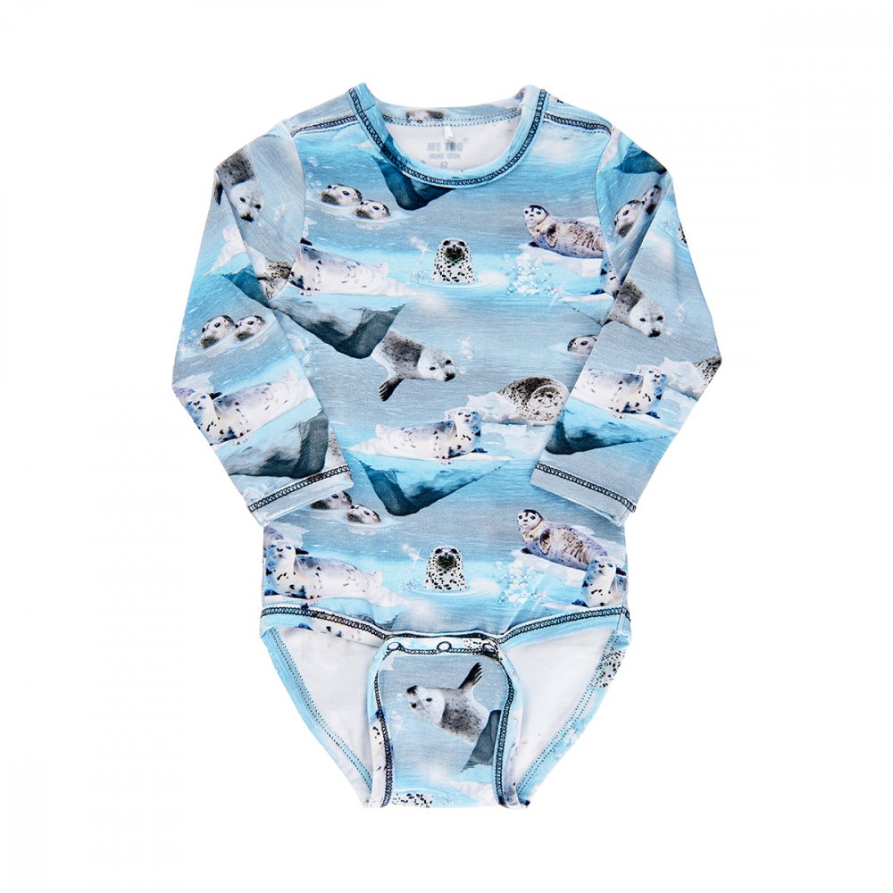 Skøn body med sæl print og lange ærmer Bodyen har lange ærmer og lukkes med trykknapper på skulder og mellem ben. Tekstil: 95% økologisk bomuld, 5% elastane