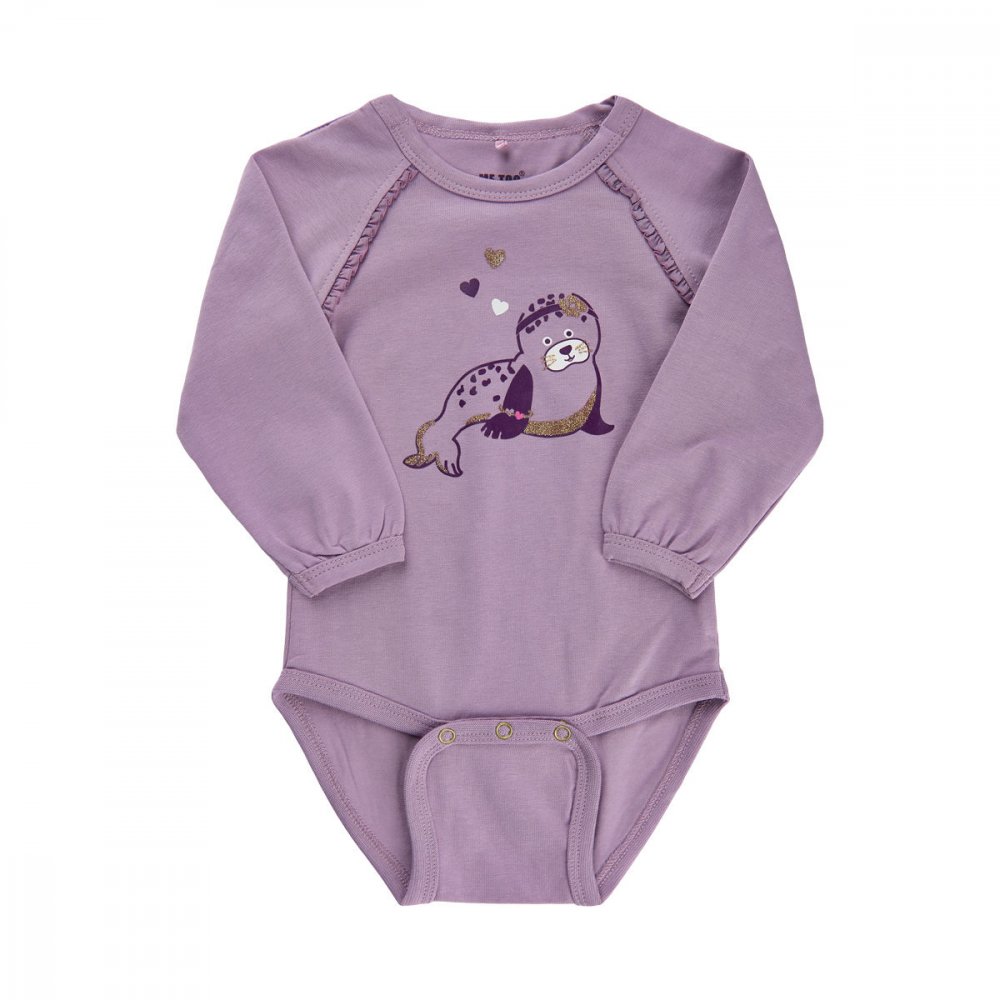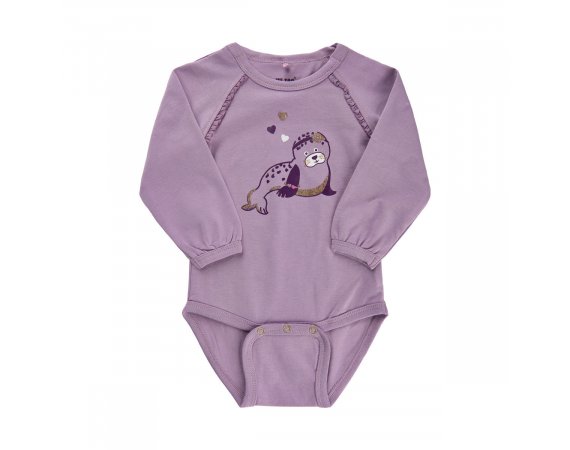 Skøn body med flæsekant og rynker ved håndled Bodyen har lange ærmer og lukkes med trykknapper på skulder og mellem ben. Oeko-tex 100 og GOTS certificeret Tekstil: 95% økologisk bomuld, 5% elastane