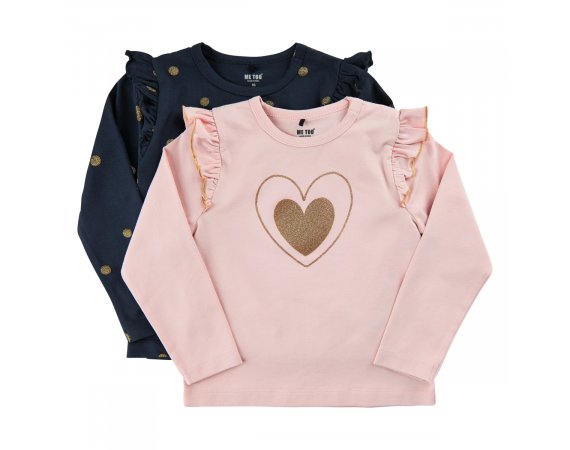 To flotte t-shirts med lange ærmer til piger Den ene bluse har prikker på den anden har hjerte på fronten. Begge bluser har flæser ved skuldre og lukkes fra str. 80-92 med trykknapper på skulder. Flot til både fest og hverdag. Tekstil: 95% Bomuld, 5% Elastane
