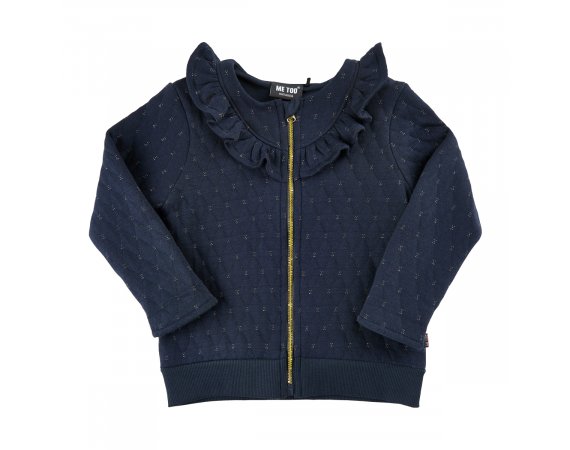 Lækker blød cardigan med flot struktur Cardigan med flæse ved hals og ryg. Lukkes med lynlås og har rib ved bund. Tekstil: 70% Bomuld, 25% Polyester, 5% Metallic Fibre