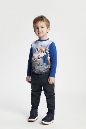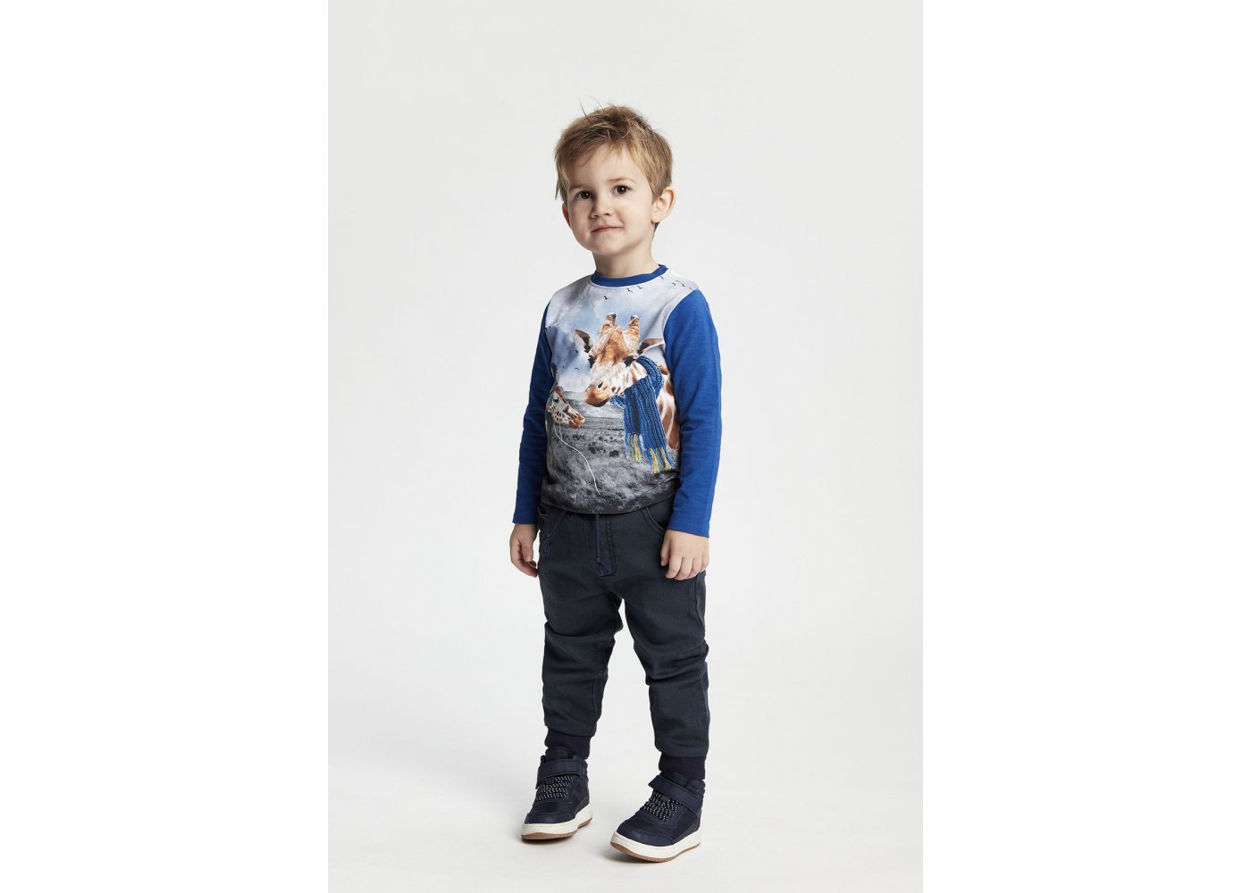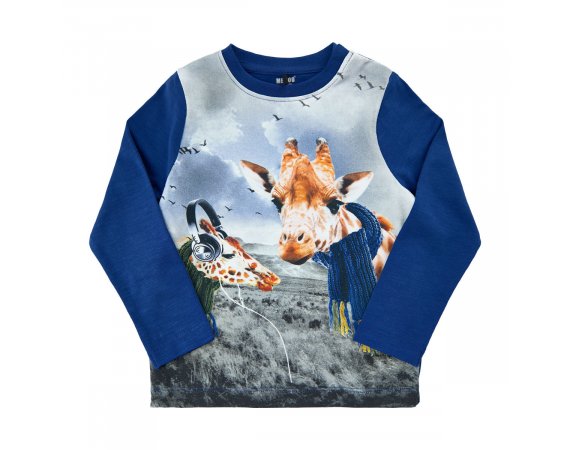 Sej T-shirt med print af giraffer med høretelefoner og halstørklæder T-shirten har lange ærmer og ribkant ved hals. Lukkes med trykknapper på skulder fra str. 80-92. Tekstil: 95% bomuld, 5% Elastane