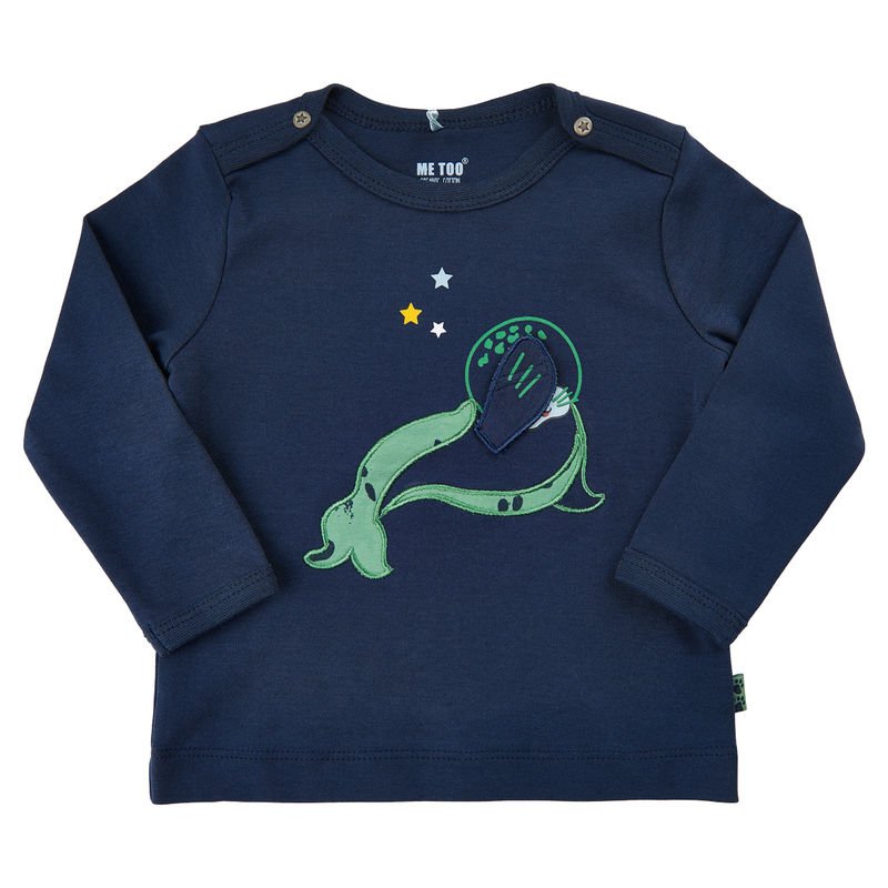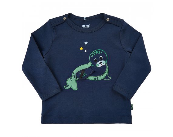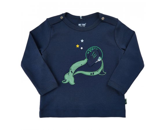 Blusen har lange ærmer og trykknap ved begge skuldre.