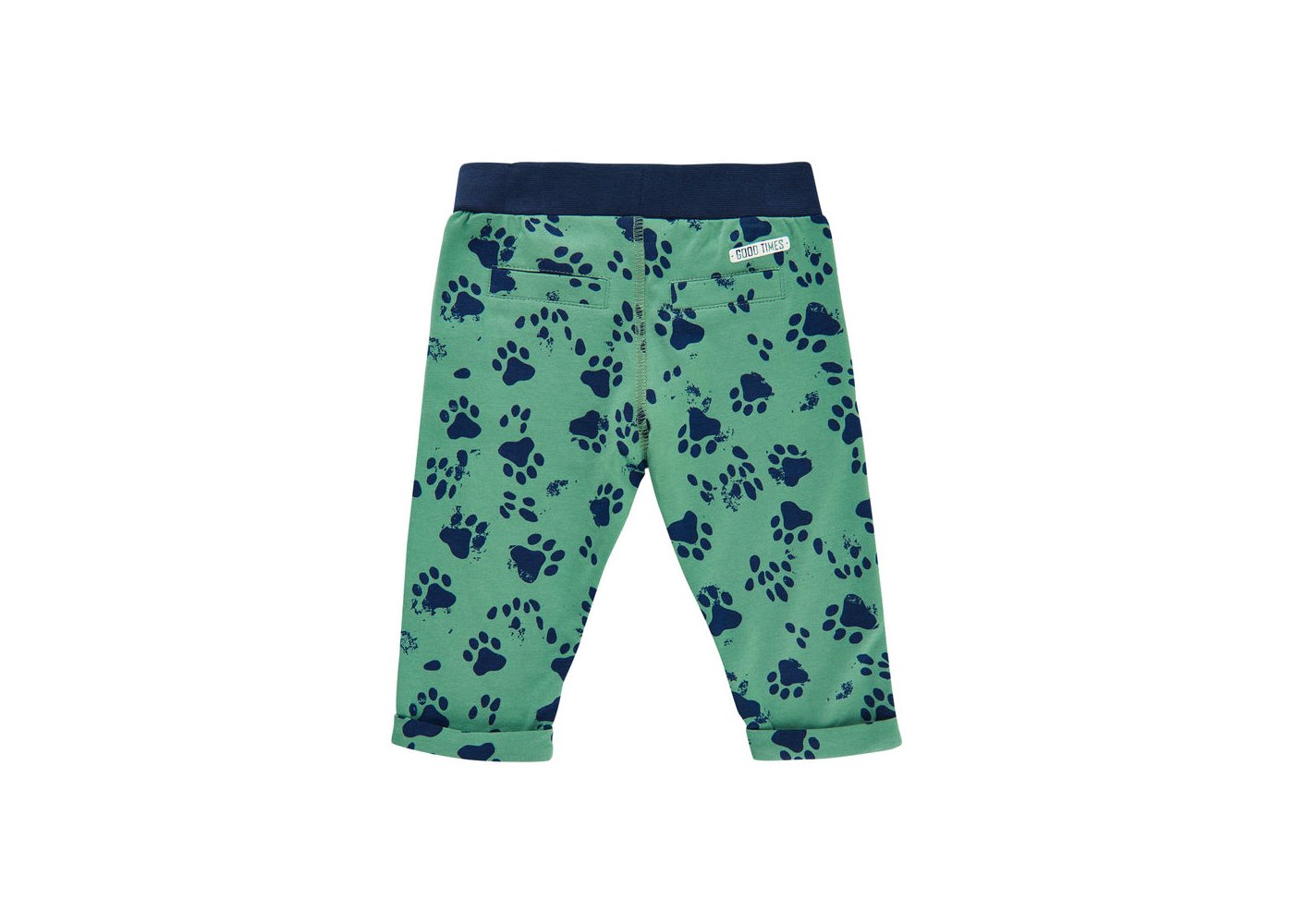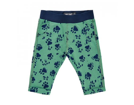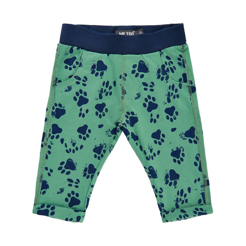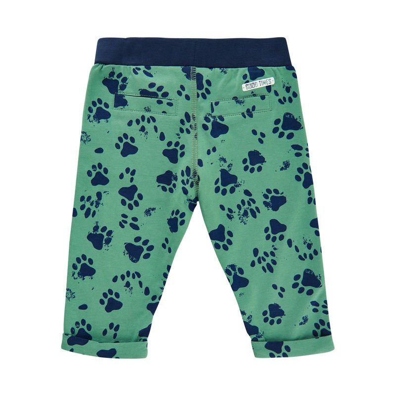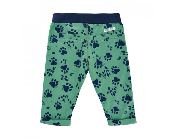 Søde bukser med all-over pote print Seje bukser til en lille dreng med pynte gylp og lommer. Buksen har elastik i taljen samt ombuk ved ankler. Tekstil: 95% Økologisk bomuld, 5% Elastane GOTS certificeret Oeko-tex 100 certificeret