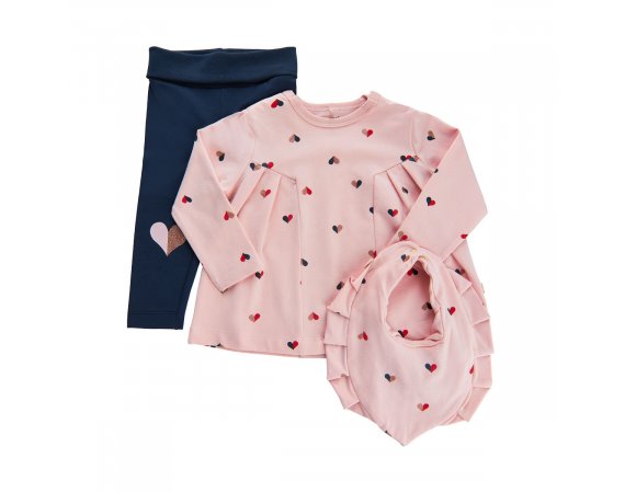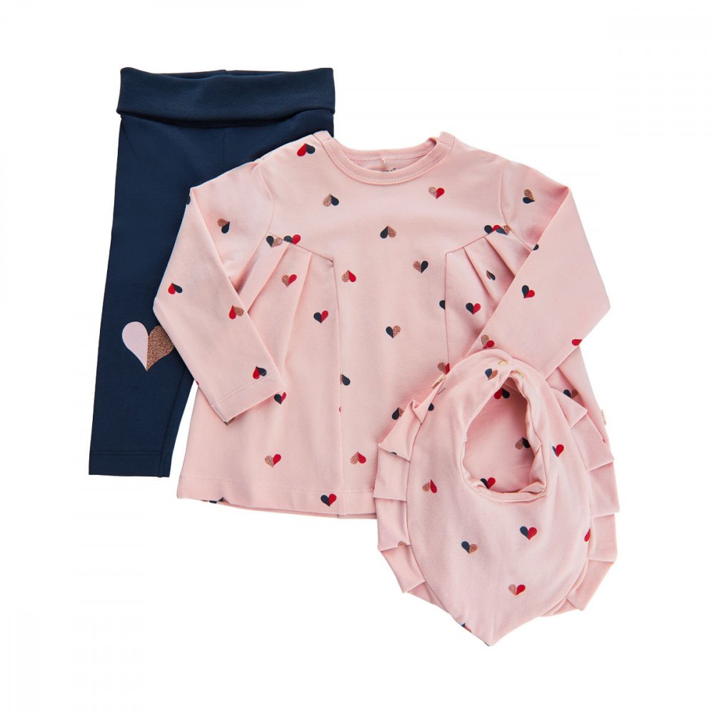 A lovely set with a blouse, trousers, and a bib in pink and blue colours.