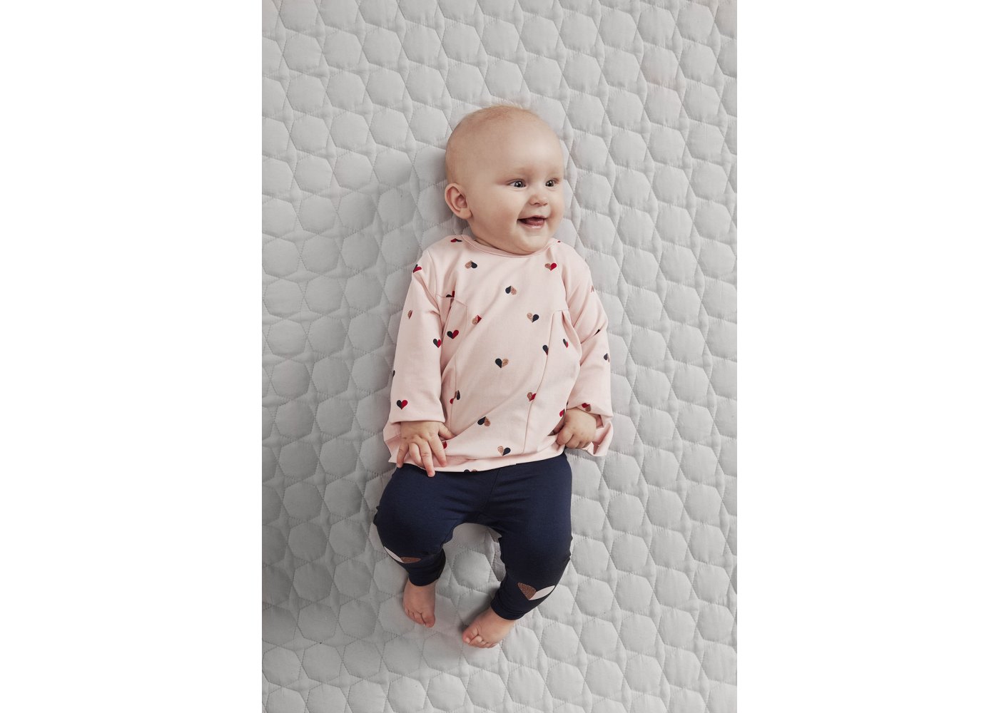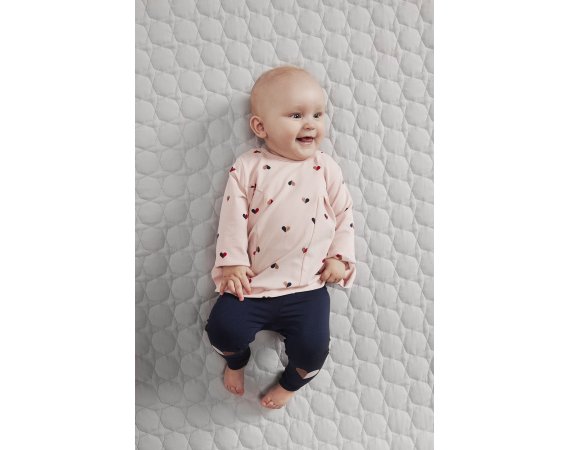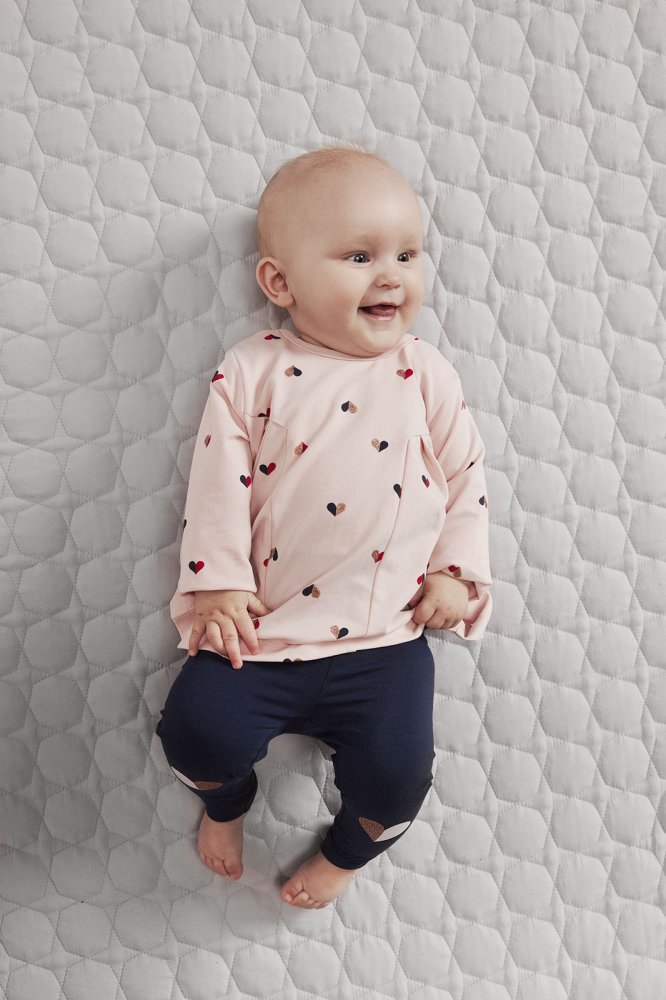 The blouse has pleats for extra width and is closed with push buttons by the shoulder. The bib has a double ruffle and is closed with a push button with two fits. Both the blouse and the bib has a heart print all-over. The lovely blue trousers have hearts on their knees and a foldable rib at the waist.