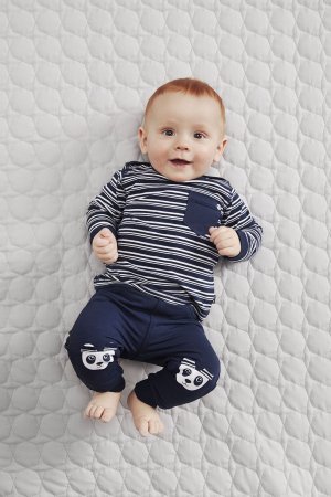 The blouse has stripes, a rib by the wrists, and a cool breast pocket. The blouse is closed with push buttons by the shoulder. The bib is closed with a push button with two fits. Both the blouse and the bib has matching stripes. The lovely blue trousers have a matching stripe by the pocket and panda heads on their knees. The trousers have a ribbed waist and a rib by the ankles.