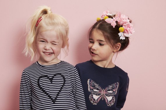 Yndig langærmet stribet t-shirt med et blåt hjerte på fronten