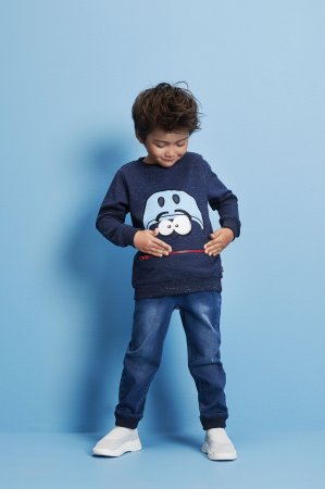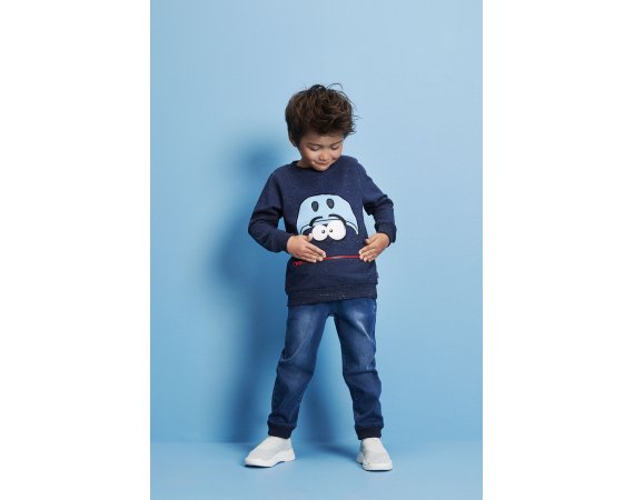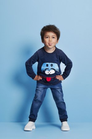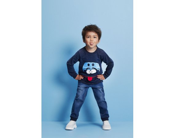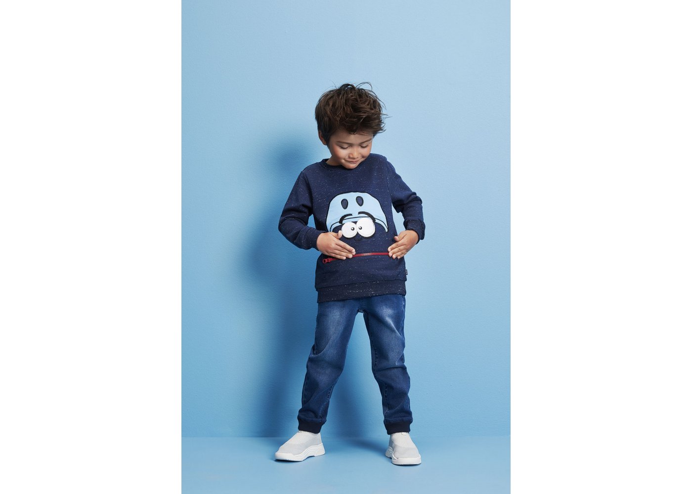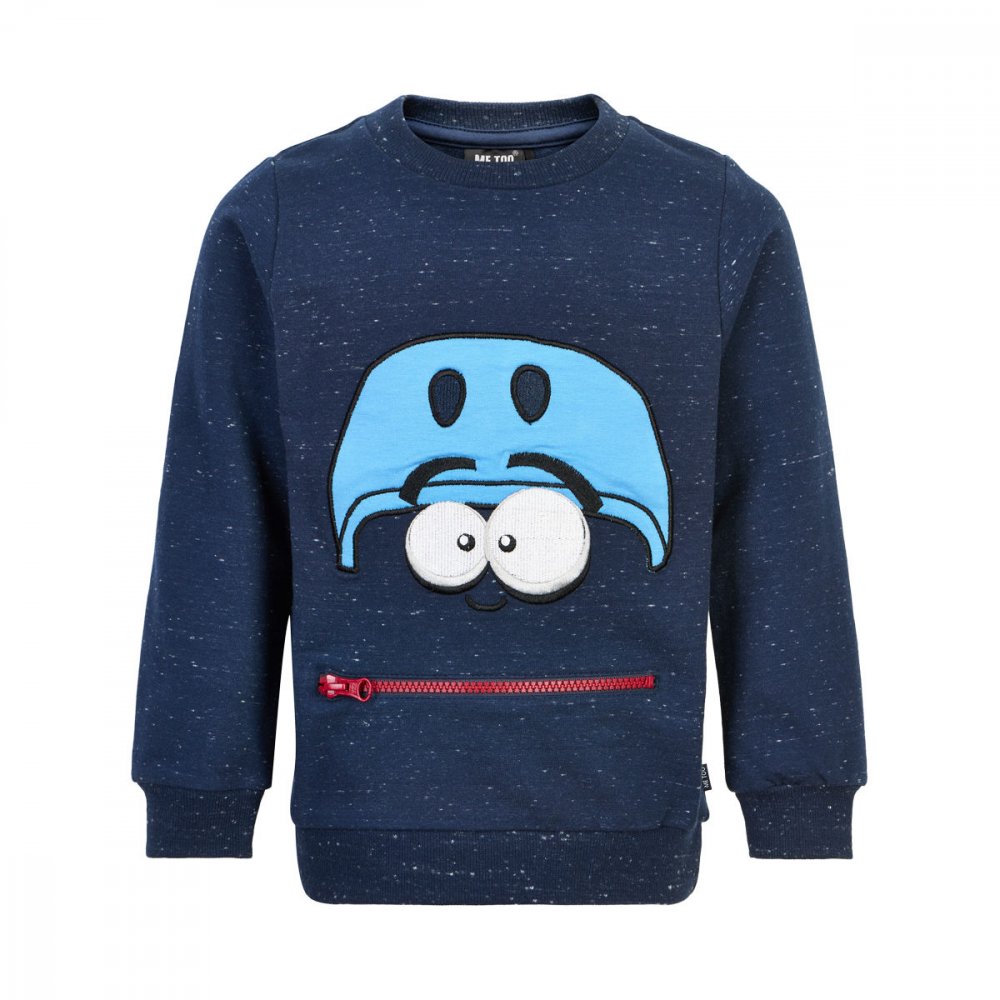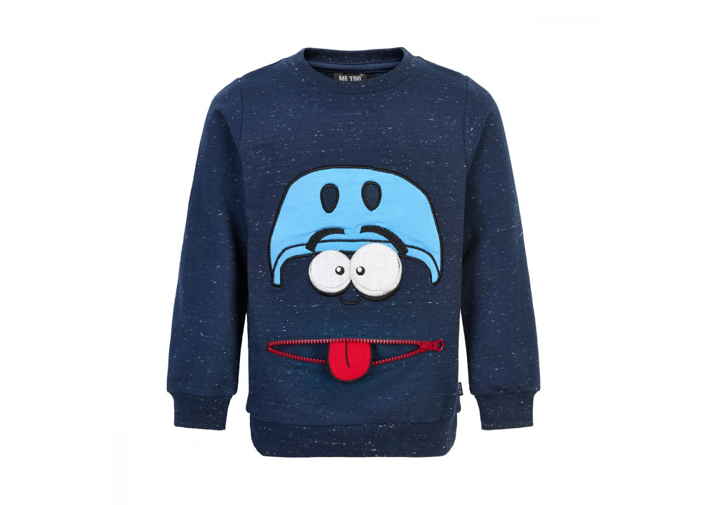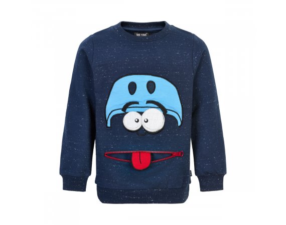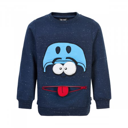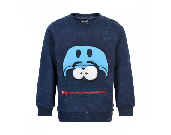 Sweatshirten har en figur, der kan åbne og lukke sin mund med lynlås. Bag lynlåsen gemmer sig en rød tunge. Sweatshirt med rib ved hals, håndled og bund. Trøjen har lange ærmer, en klassisk pasform og trykknapper på skulder fra str. 80-92.