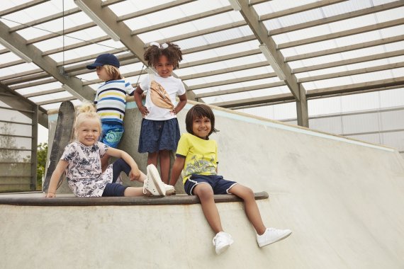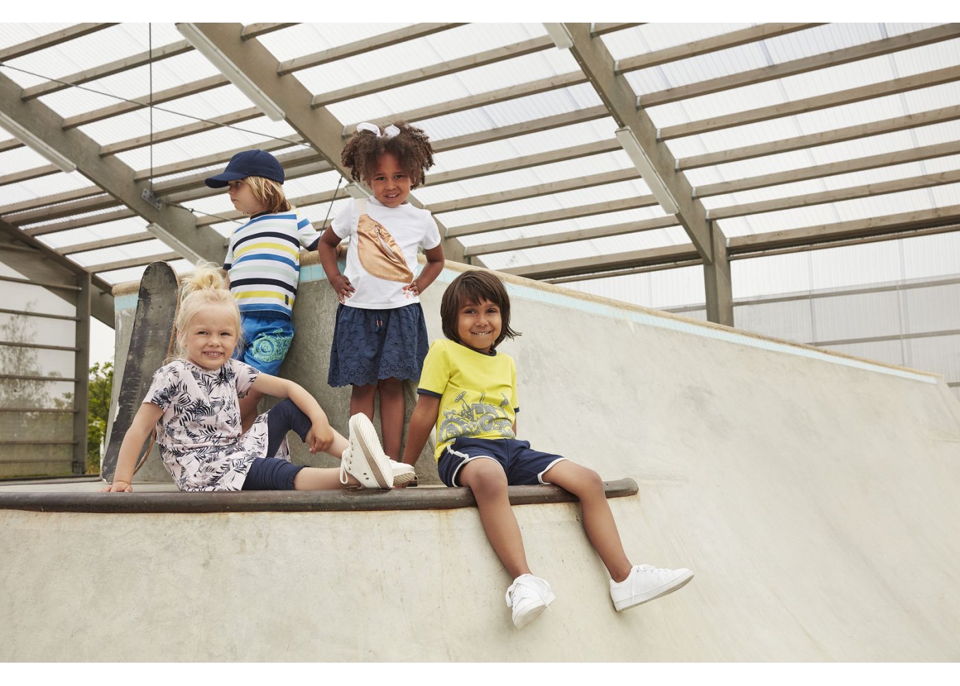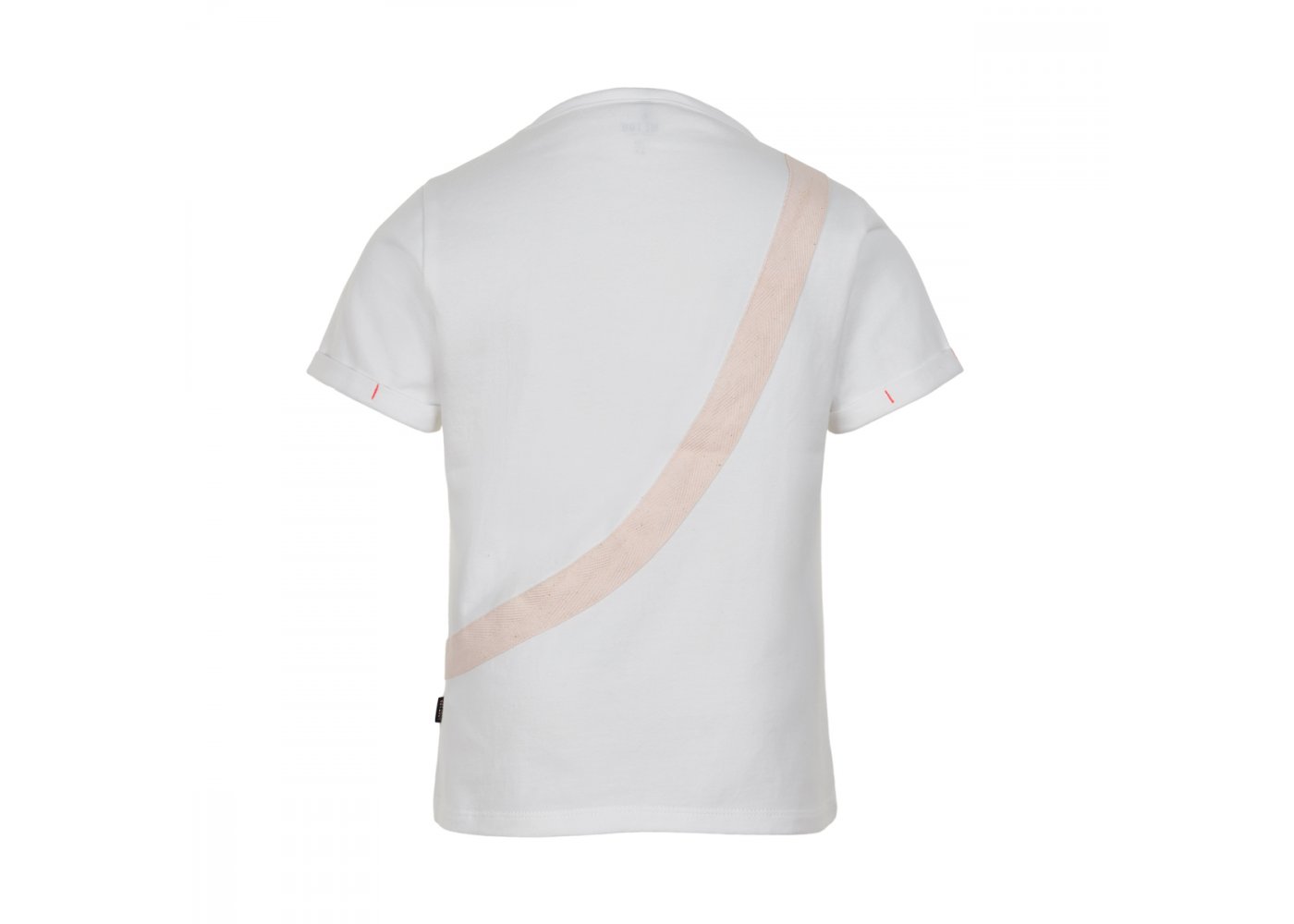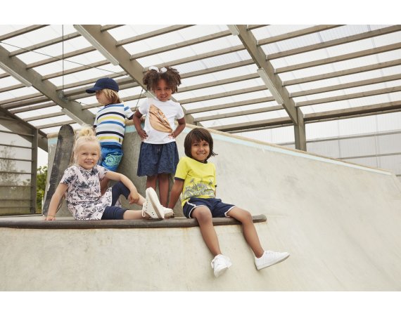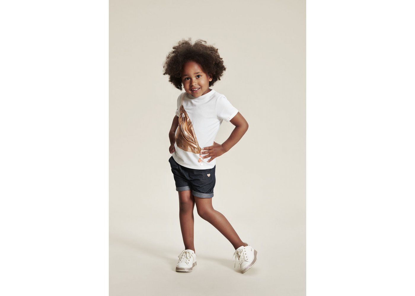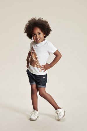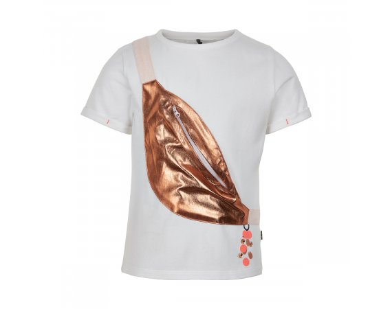 T-shirt with roll-up sleeves and narrow fixed edge at the neckline as well as the waist. The t-shirt has beautiful decorative sequins on bag. The sizes 80-92 has press studs on the shoulder.