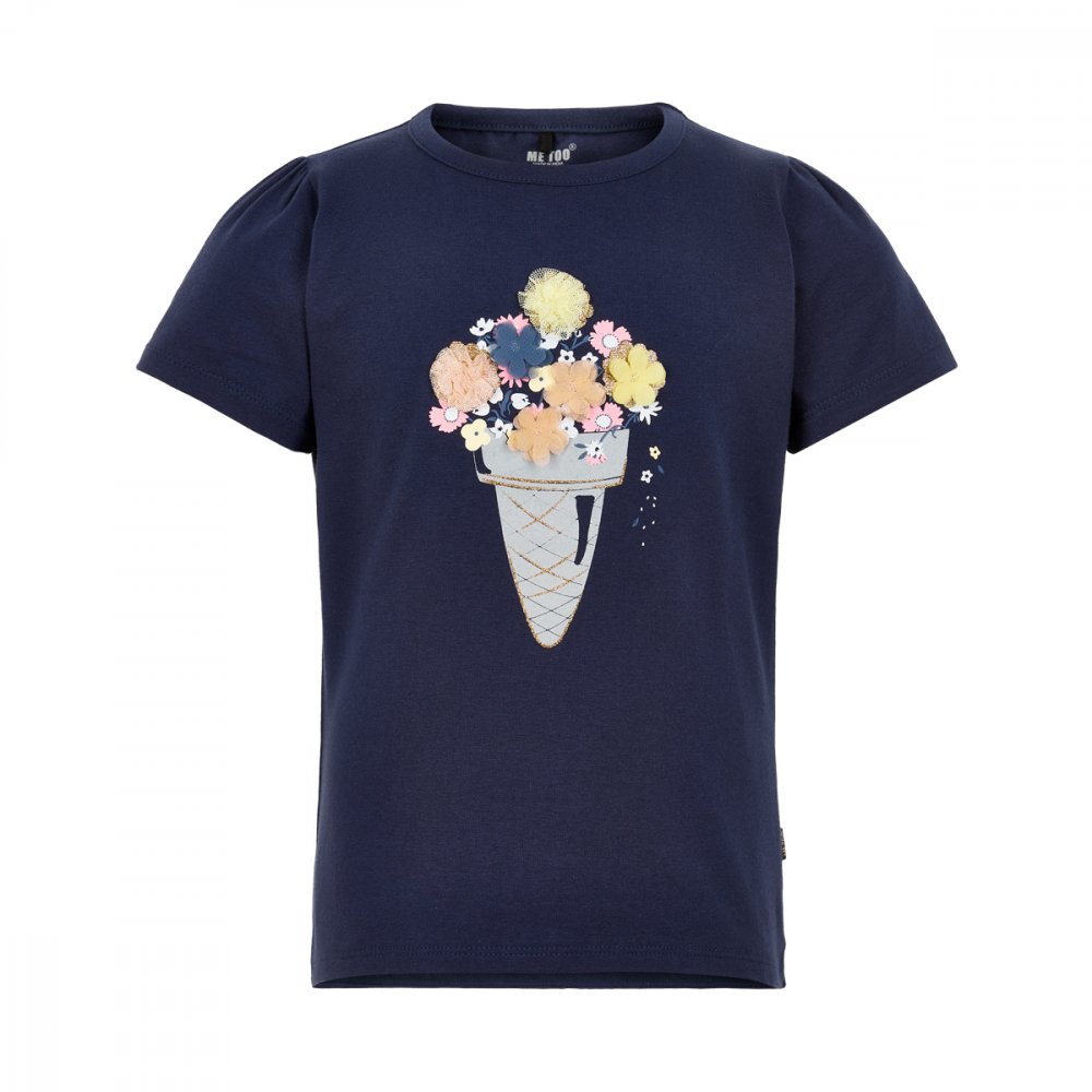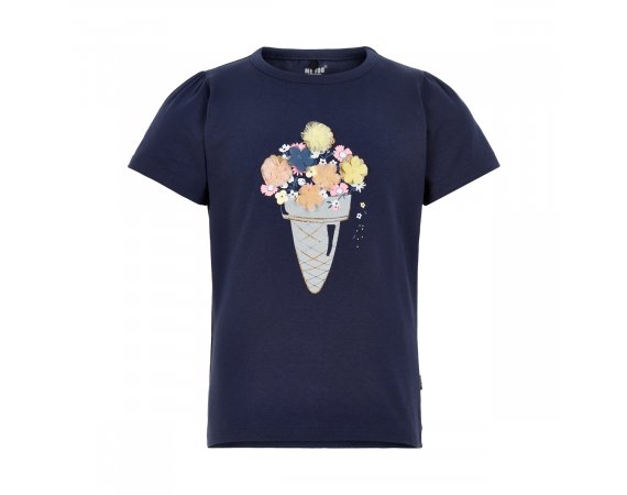 T-shirt with an ice cream waffle filled with colourful flowers. Some of the flowers are printed and others are sewn on. The sizes 80-92 has press studs on the shoulder.