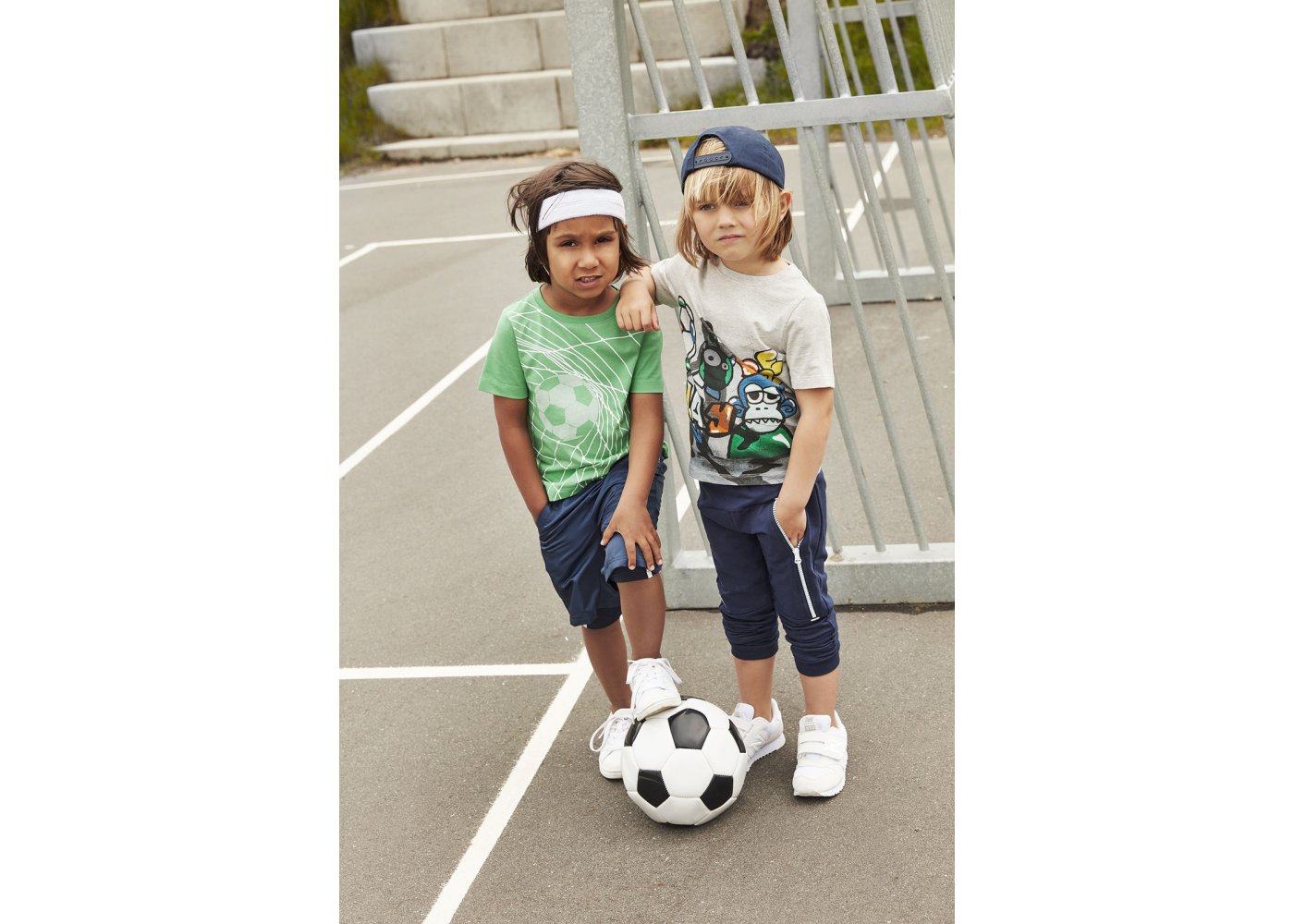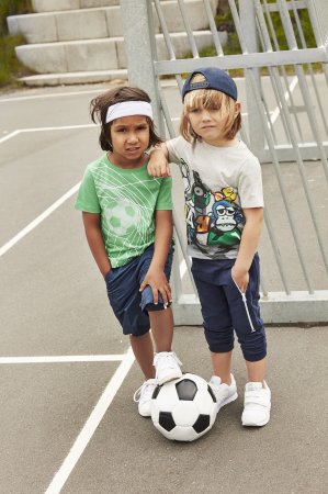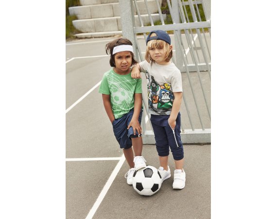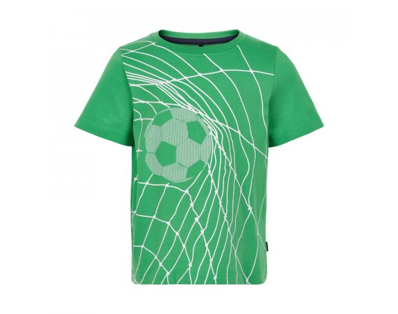 Kortærmet T-shirt med print af en fodbold i et mål.