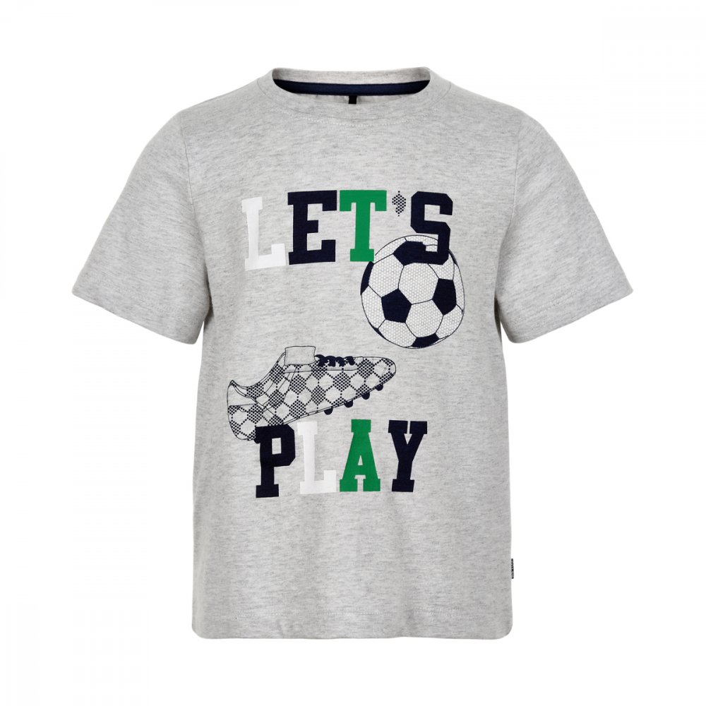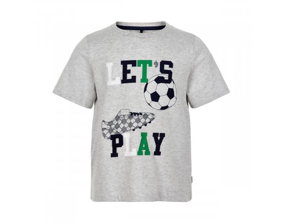 Short-sleeved T-shirt with the print of a football, football boots, and text in several colours. The t-shirt has a rib at the neckline and sizes 80-92 has press studs on the shoulder.