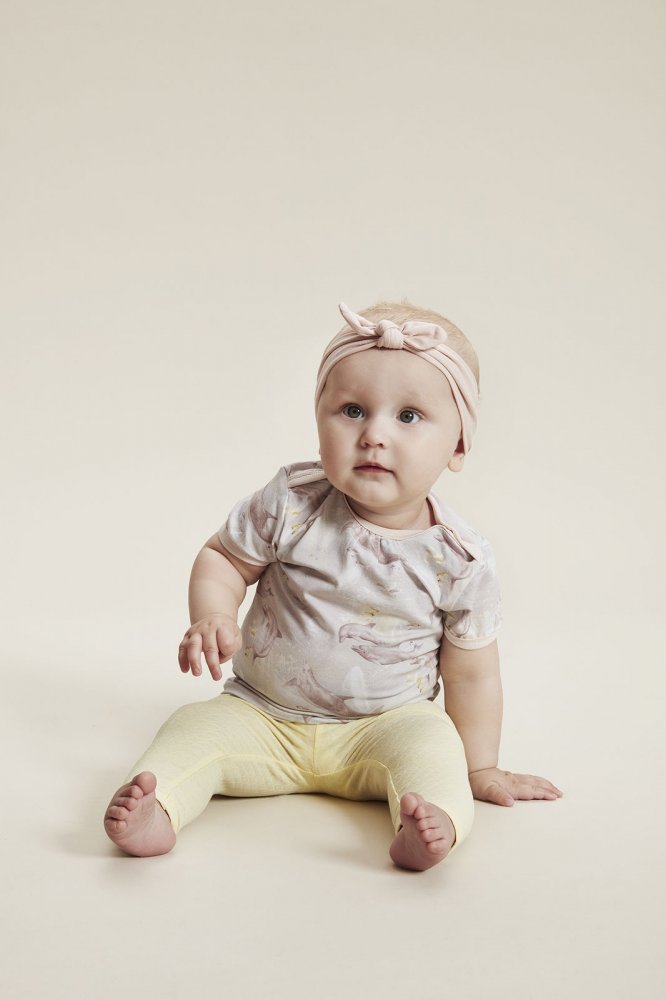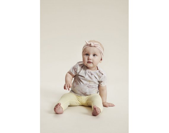 Body med rynkedetaljer i halsåbning og ved håndled. Den har fast ribkant i kontrastfarve i alle åbninger og lukkes med trykknapper på skuldre og mellem ben.