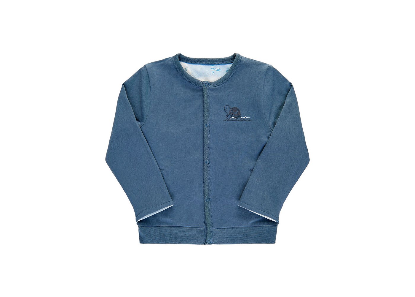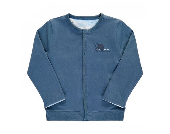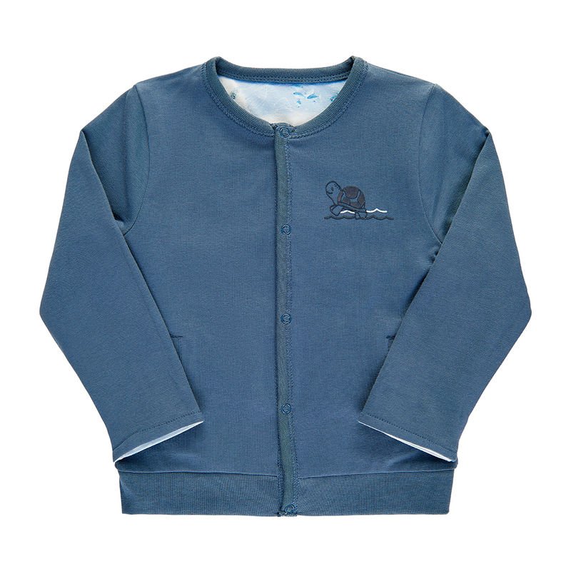 Langærmet cardigan med skildpadde print på den ene side. Vendes cardigan, får du en ensfarvet cardigan. Cardigan med ribkant i halsudskæring og ned foran ved trykknaplukning. Trøjen har to lommer fortil, opsmøg ved håndled og bred ribkant forneden.