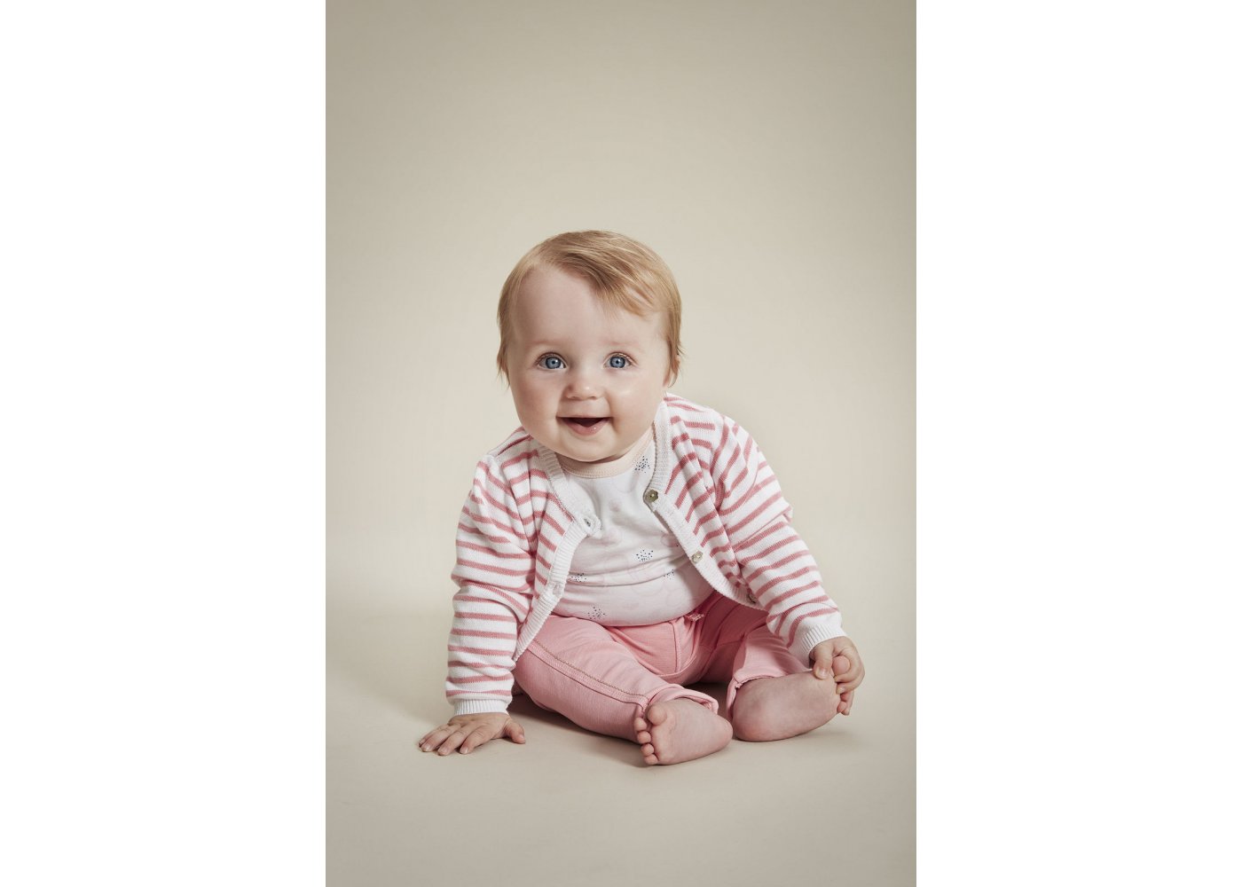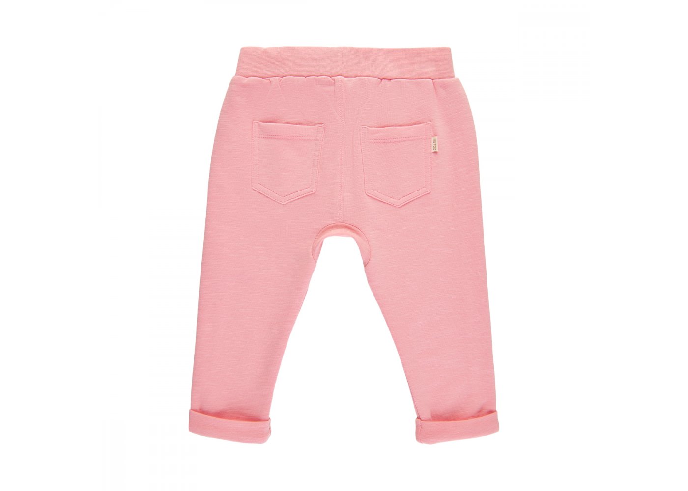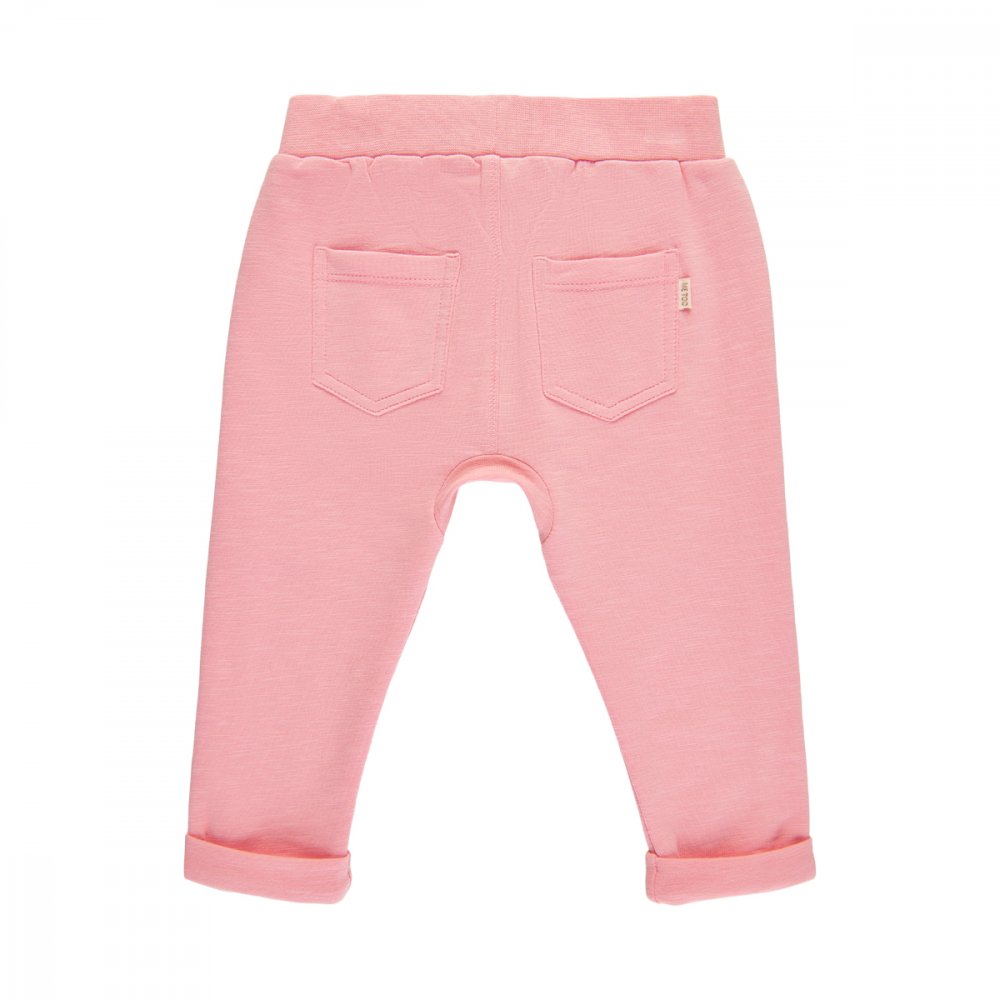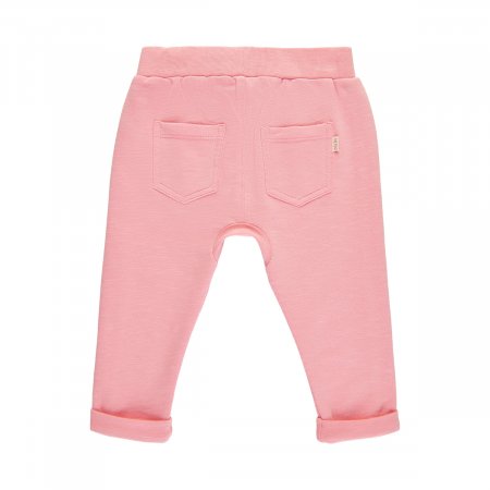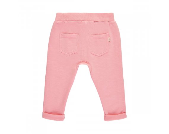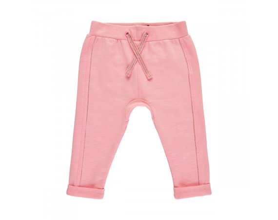The trousers have a hem at the ankles and a ribbed hem with elastic and a drawstring at the waist.