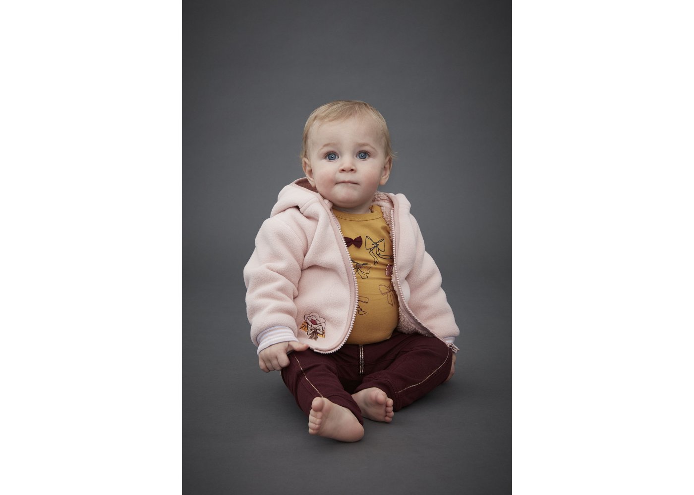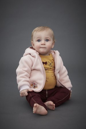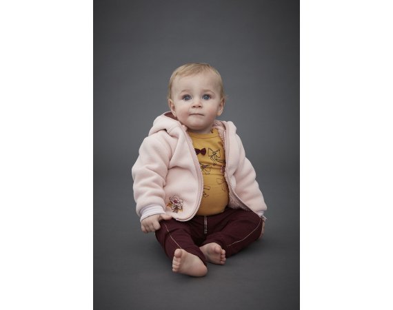 Bodyen har elastik-rynk ved håndled, fast ribkant i hals og ved ben og lukkes med trykknapper på skulder og imellem ben.