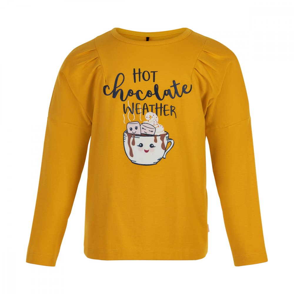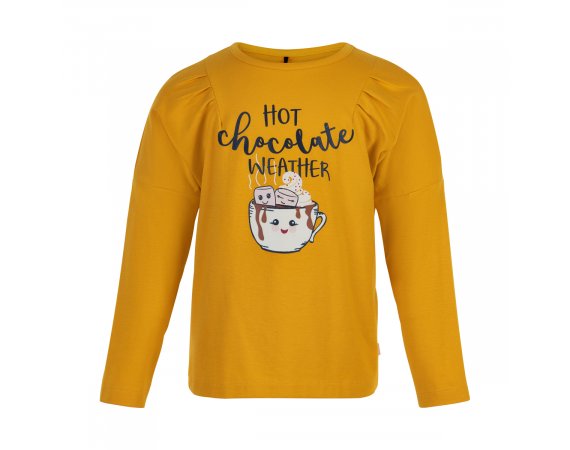 Smart langærmet jersey t-shirt med rynk foran på brystet. Blusen er lidt længere bagtil og har et sjovt selvlysende print af en kop og tekst foran. Bemærk at der er trykknapper på skulder fra str. 80-92.