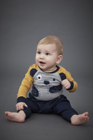 Yndig langærmet og flerfarvet body med en fræk bjørn der blinker på brystet. Bodyen har raglan ærmer, rib ved håndled og ribkant i hals og ved ben. Den lukkes med trykknapper på venstre skulder og imellem ben.