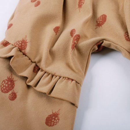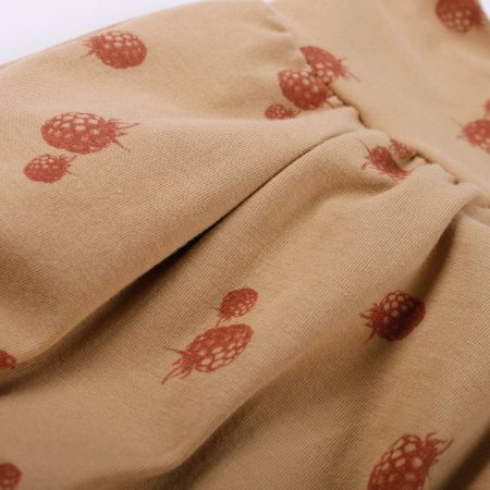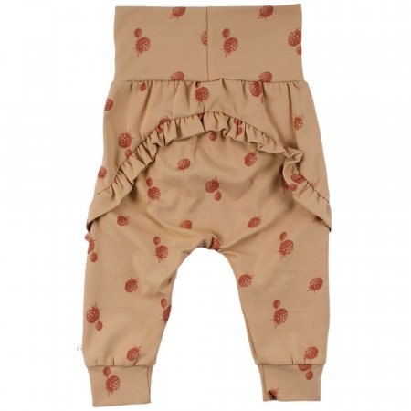 Lækre bløde bukser fra müsli med print af bær. Bukserne har fine flæse detaljer ved begge knæ og bagdel. Buksen har en dejlig bred elastisk foroven, der kan foldes efter behov. Fremstillet i den dejligste bløde strækbar kvalitet for optimal pasform.