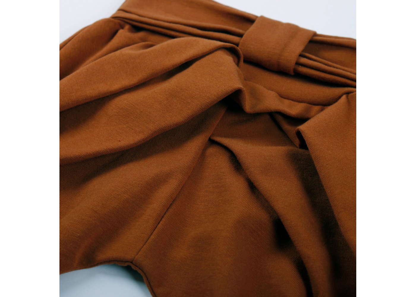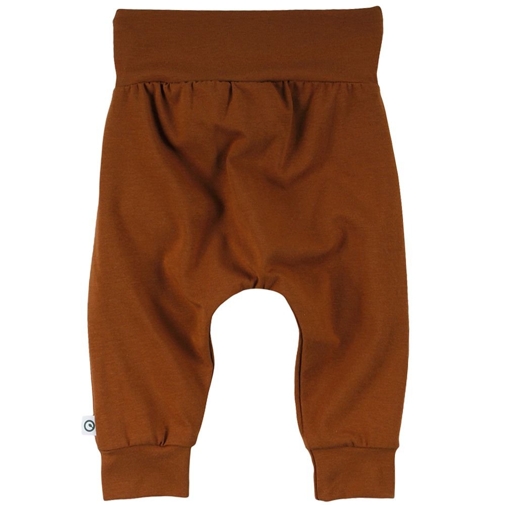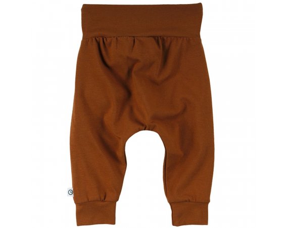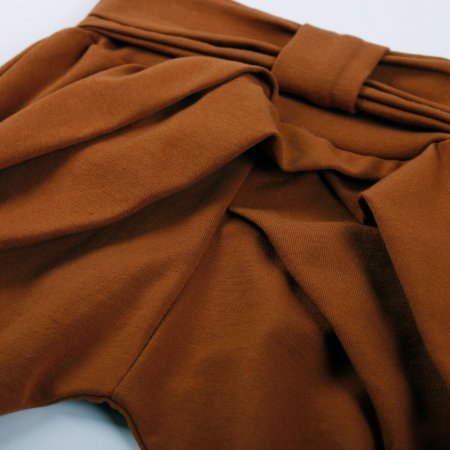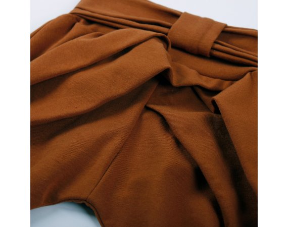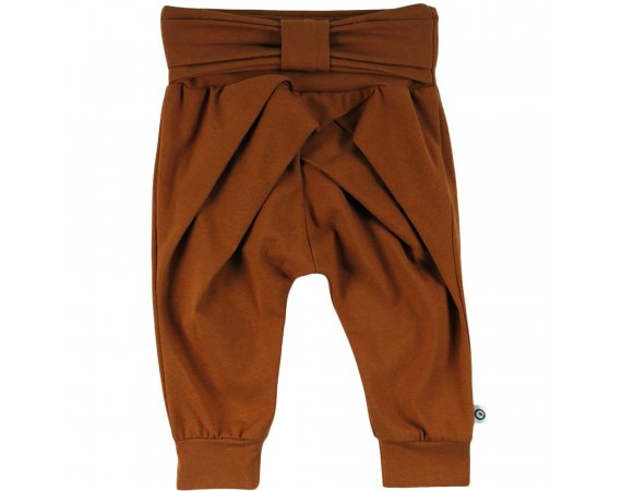 Smarte ensfarvede bukser i okker-farve med sløjfe og læg på fronten. Bukser med ribkant ved ankler og en bred ribkant med en flot sløjfe i taljen. De er fremstillet i en lækker, blød og strækbar bomuldskvalitet, der gør dem behagelige at have på.