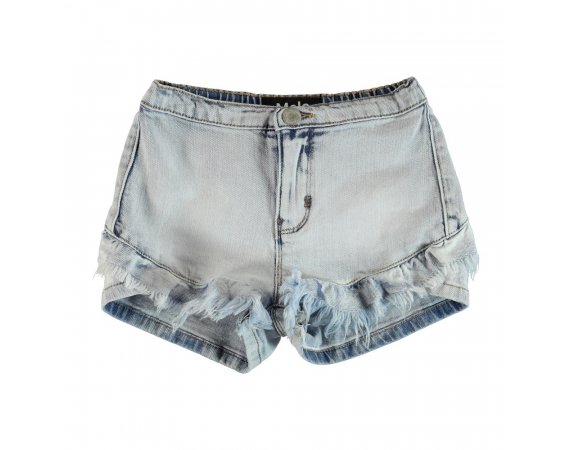 Agnetha er et par lyse denimshorts, der er kortere i siderne og har frynser på front og numse