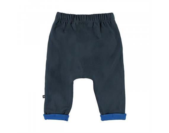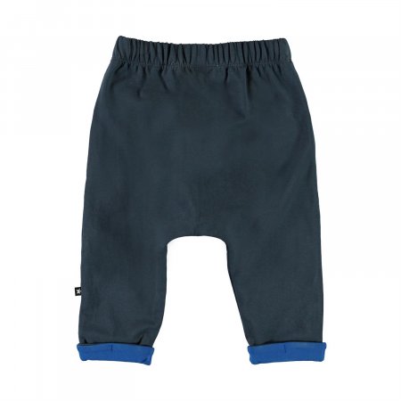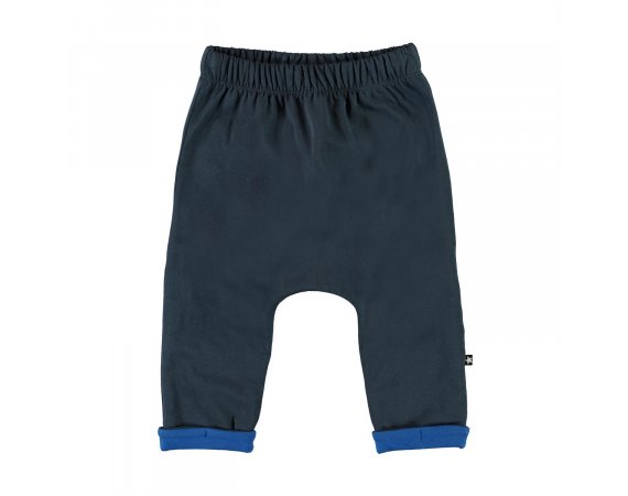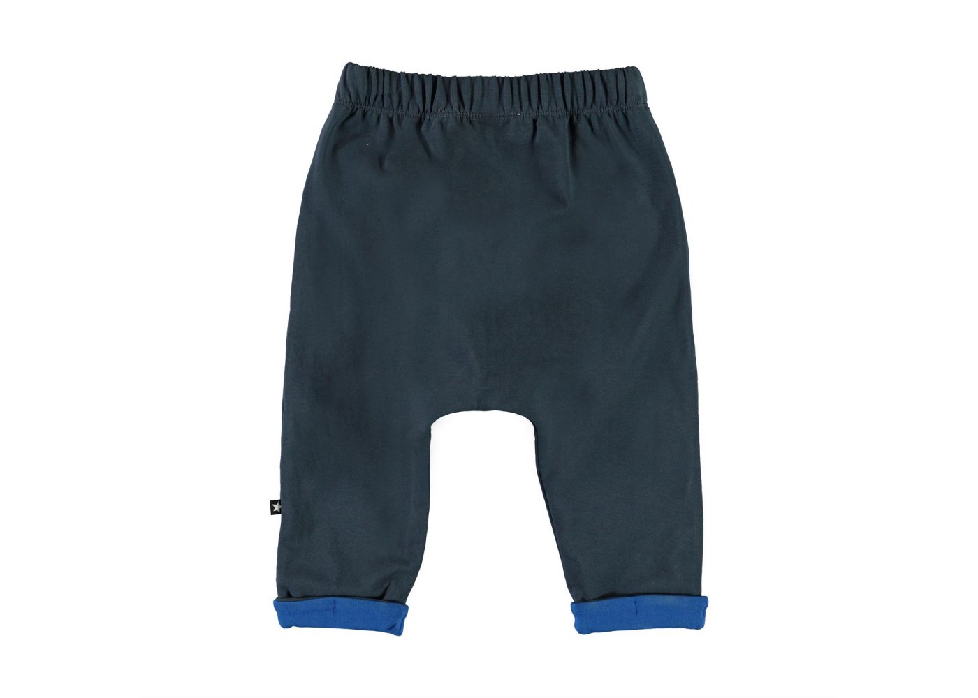 Soya fra Molo er et par bløde og behagelige babybukser i blå med skønt ombuk ved ankler i kontrastblå farve. Bukserne har elastik i livet.