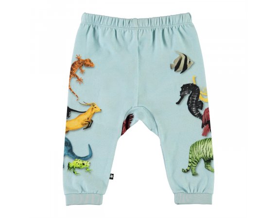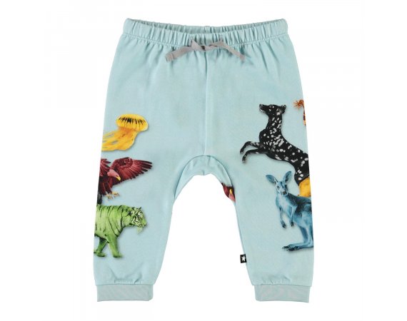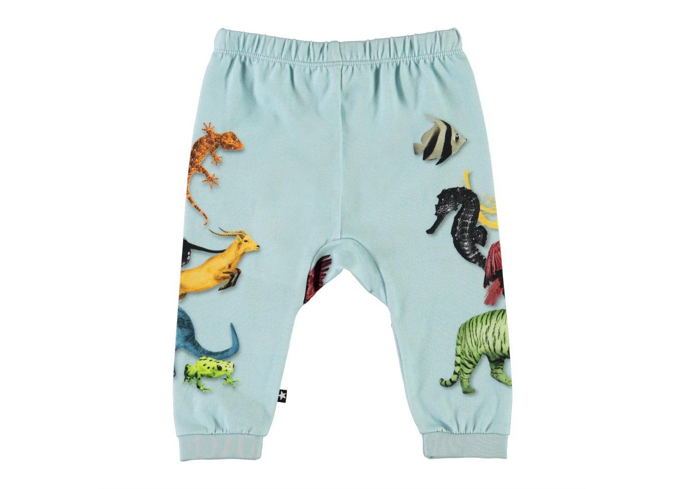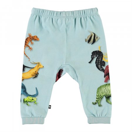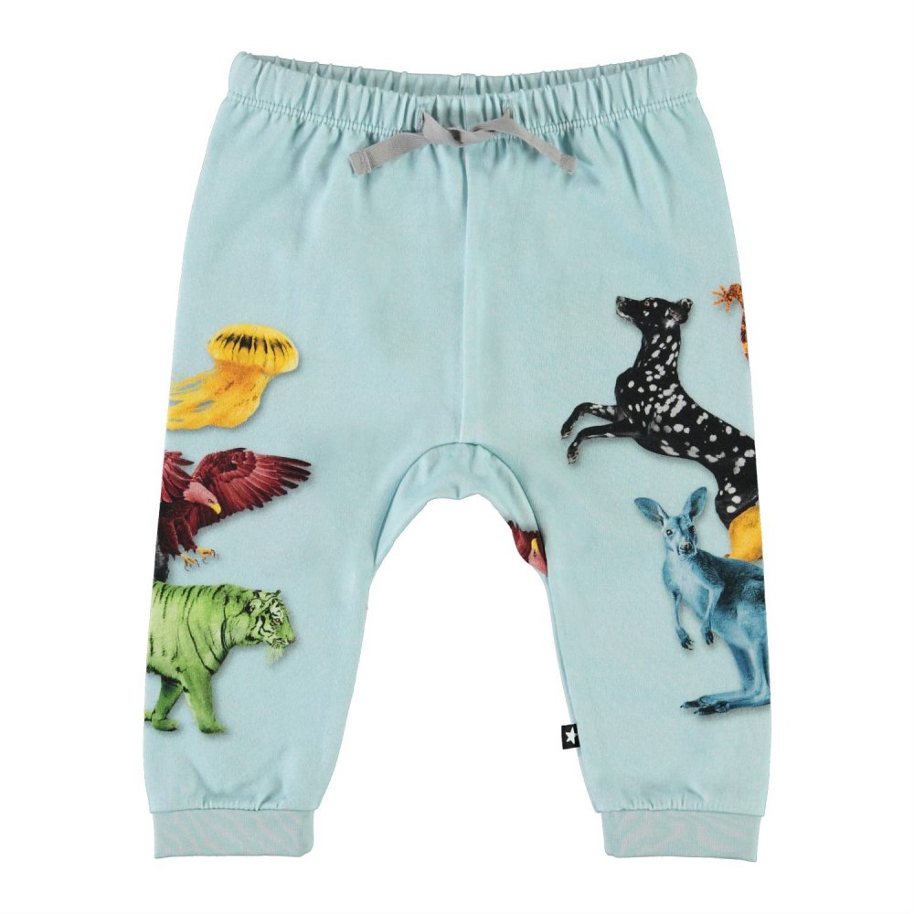Lækre blå baby bukser med skønne dyrefigurer. Bukserne har rib ved ankler, elastik og bindebånd i livet. Tekstil: 95% Økologisk Bomuld, 5% Elastan GOTS-certificeret/Certificeret af Ecocert Greenlife