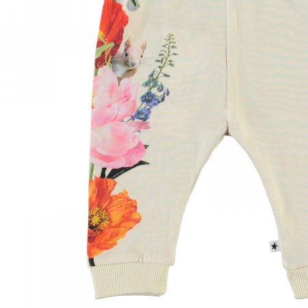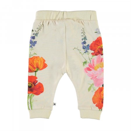 Lovely baby trousers in a soft fabric with a print of flowers and animals on the sides.