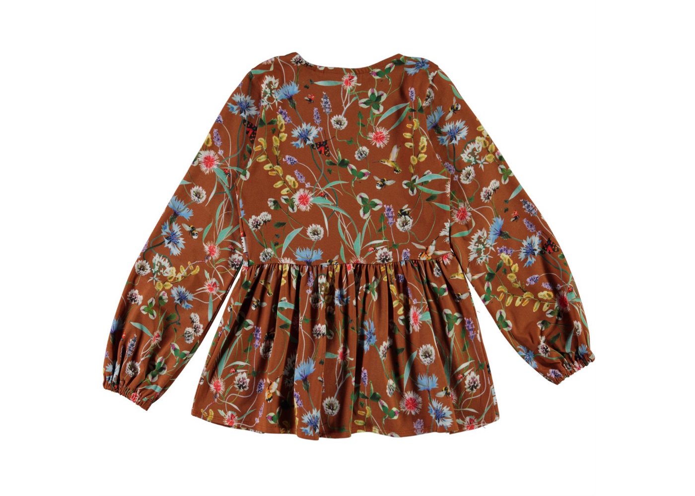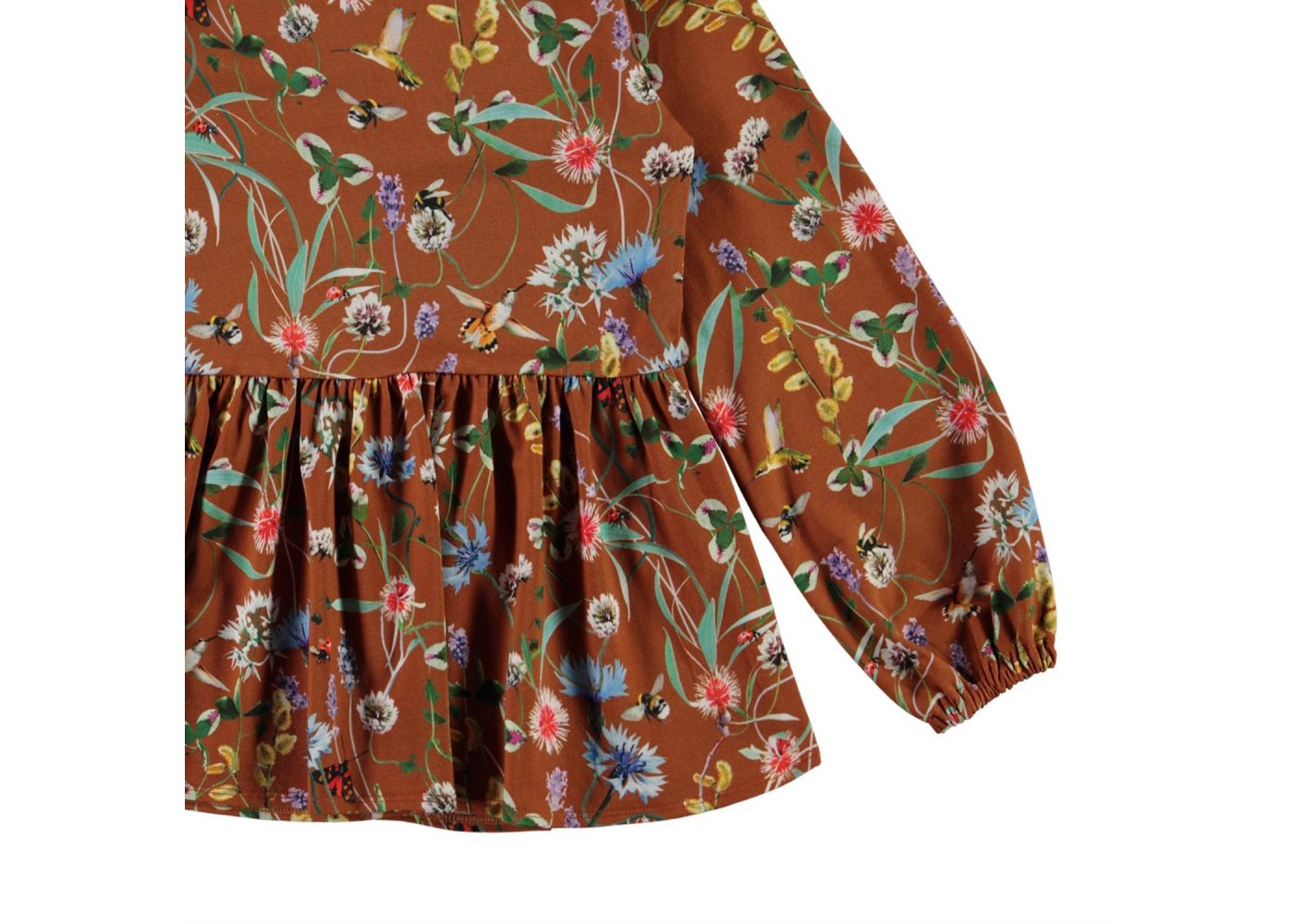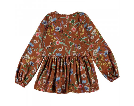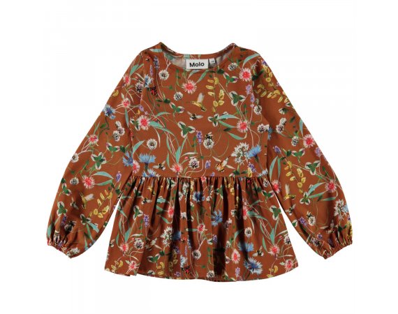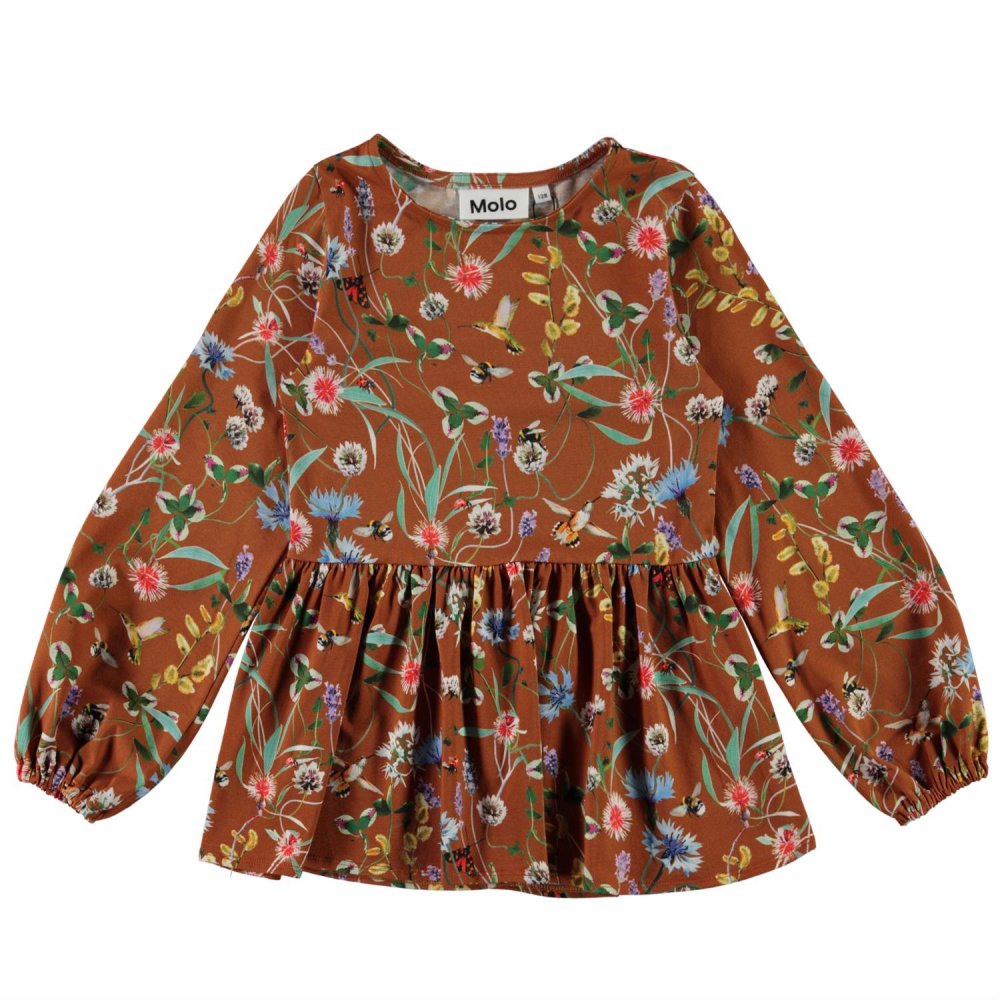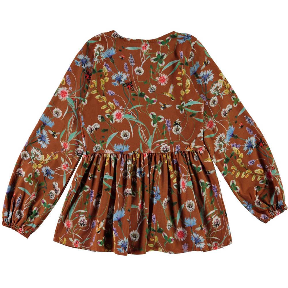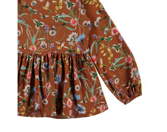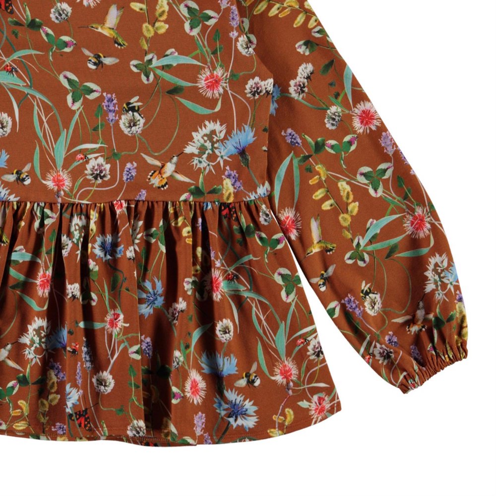 Flot og lækker brun bluse med print af vilde blomster og små insekter fra Molo.