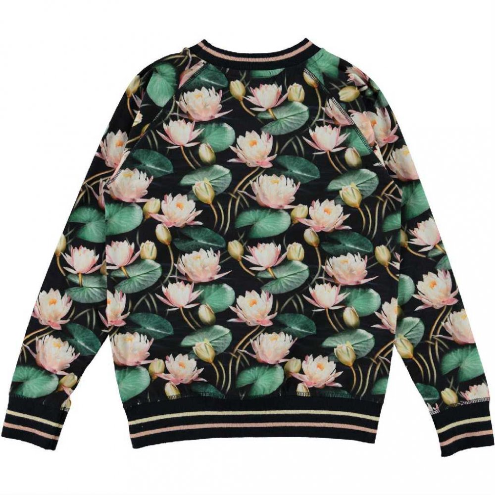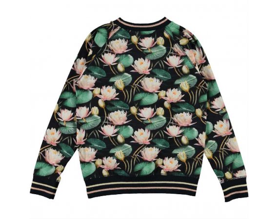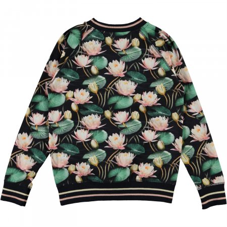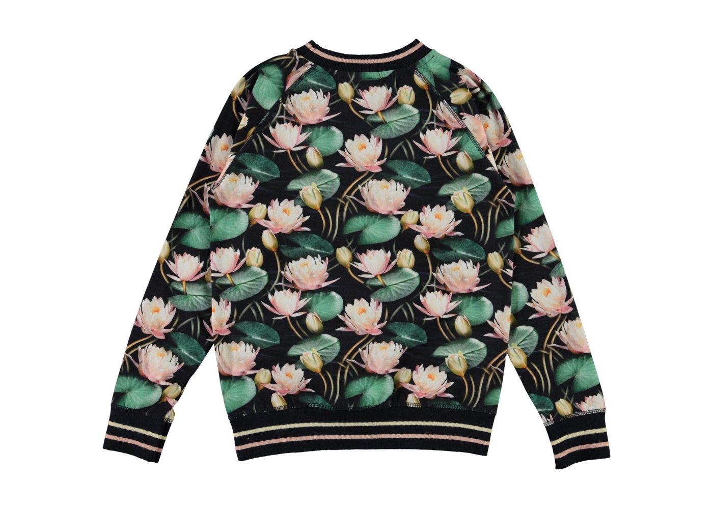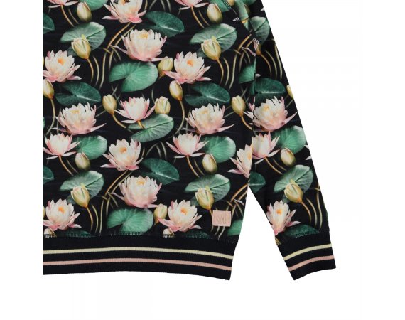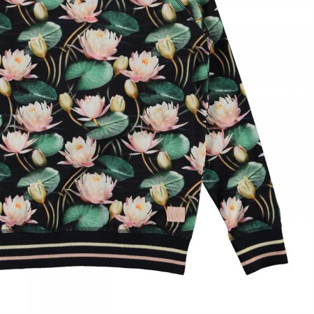 A pretty black blouse with green waterlilies with rose-pink and yellow flowers.