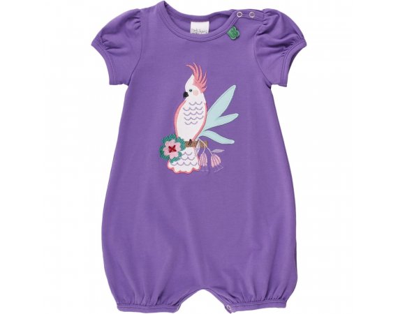 Fancy romper in a soft stretchable quality and short sleeves and legs. There are wrinkles at the sleeves and around the legs.