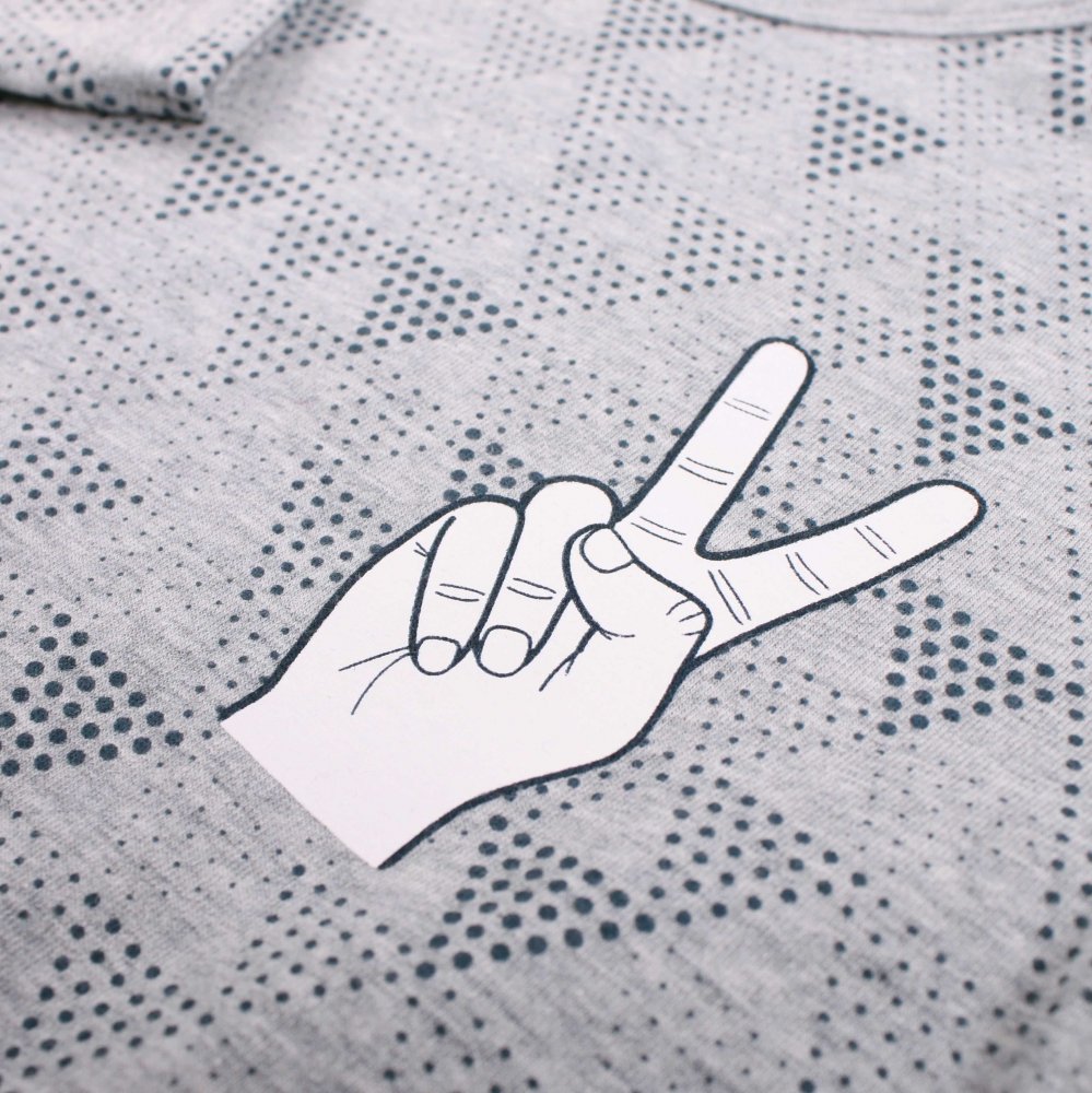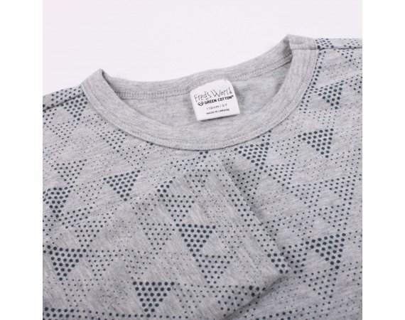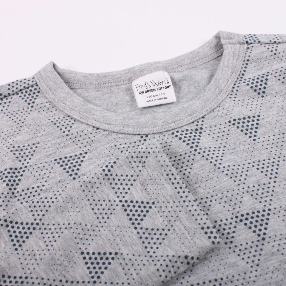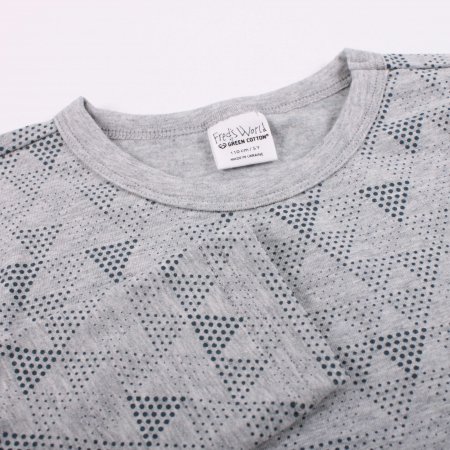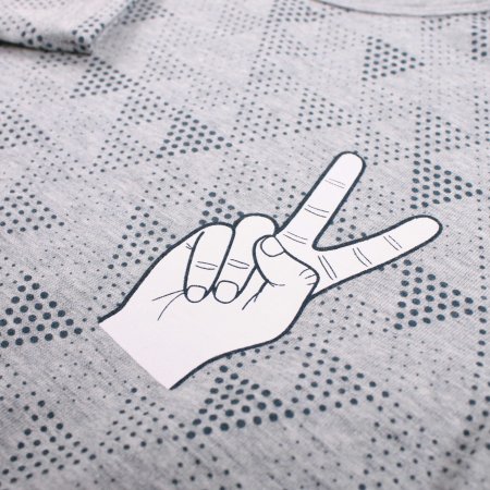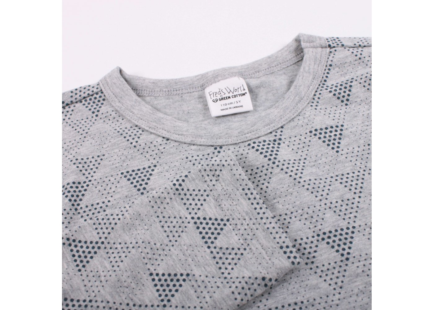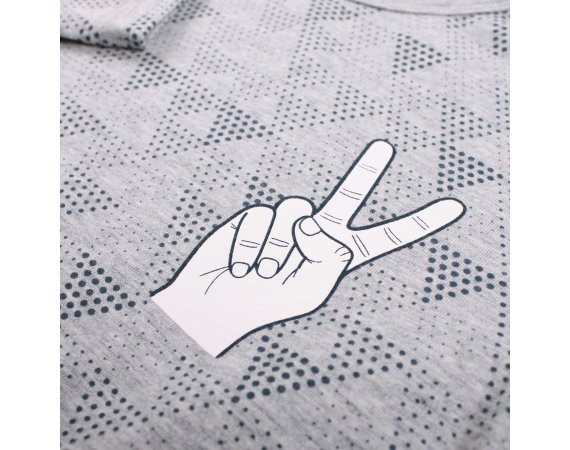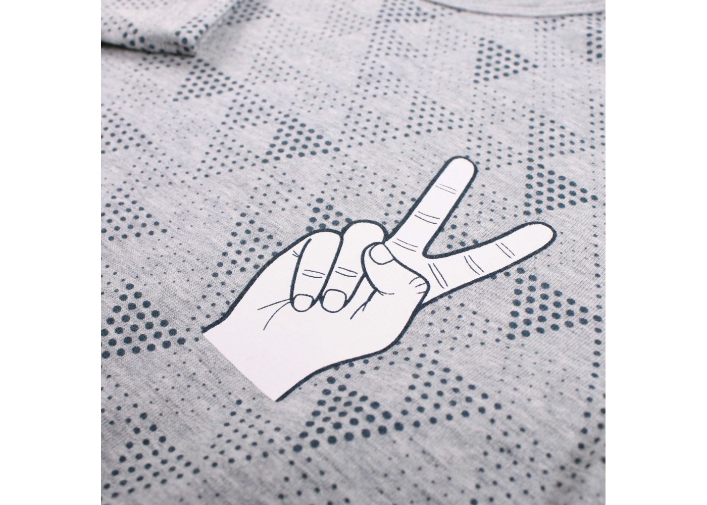 Langærmet grå T-shirt med peace tegn på brystet og print af prik-trekanter over det hele. T-shirten er fremstillet i en lækker, blød og strækbar kvalitet.