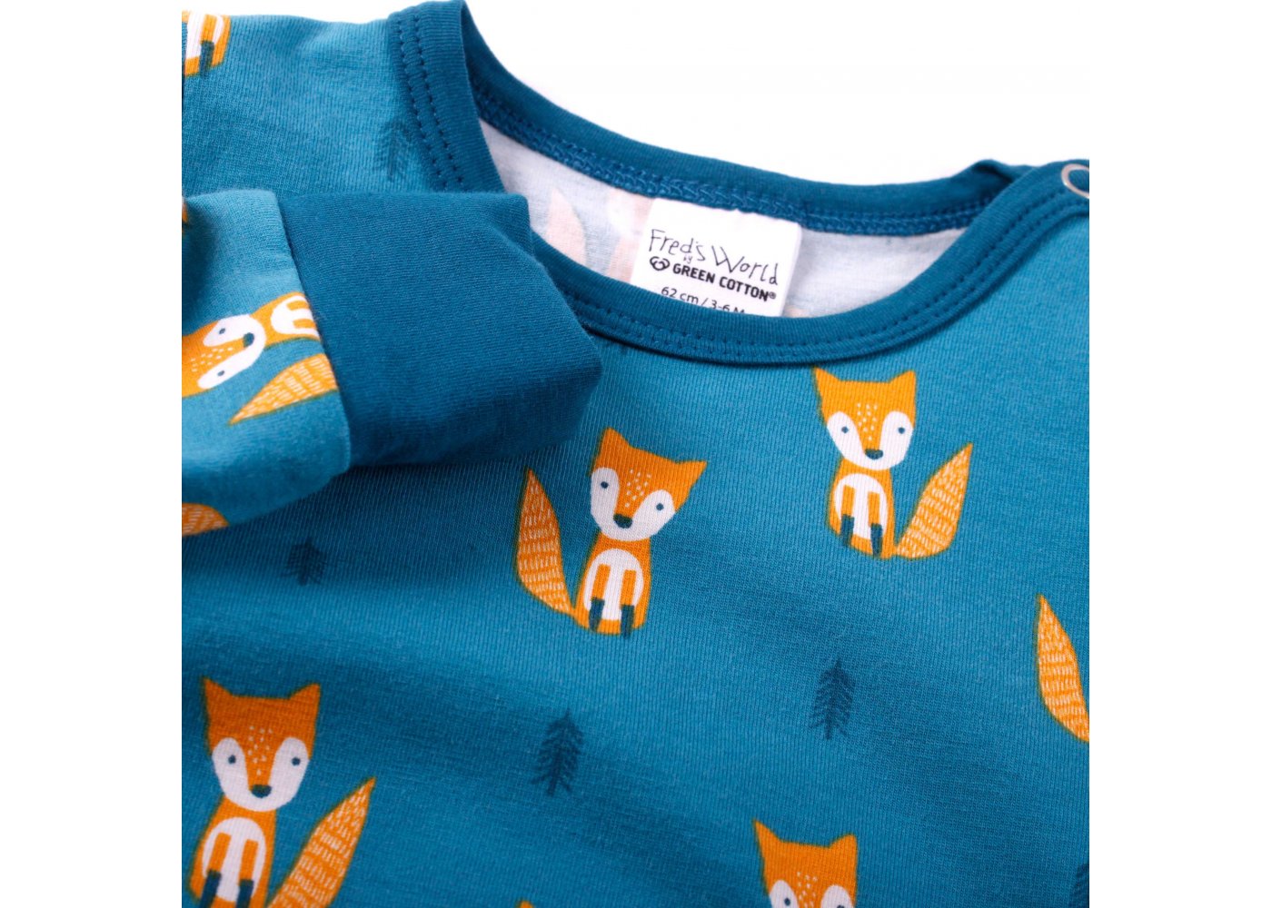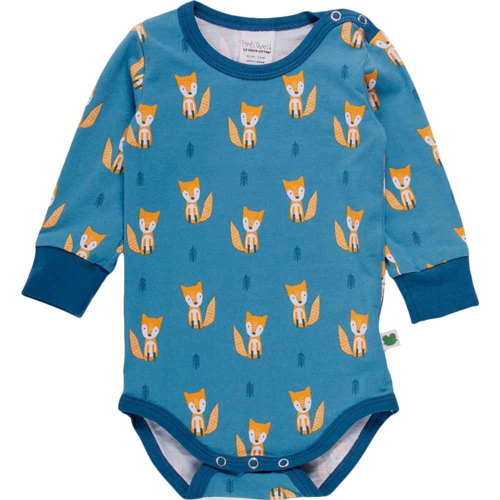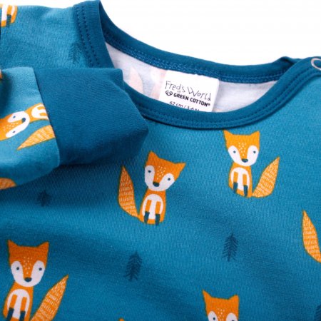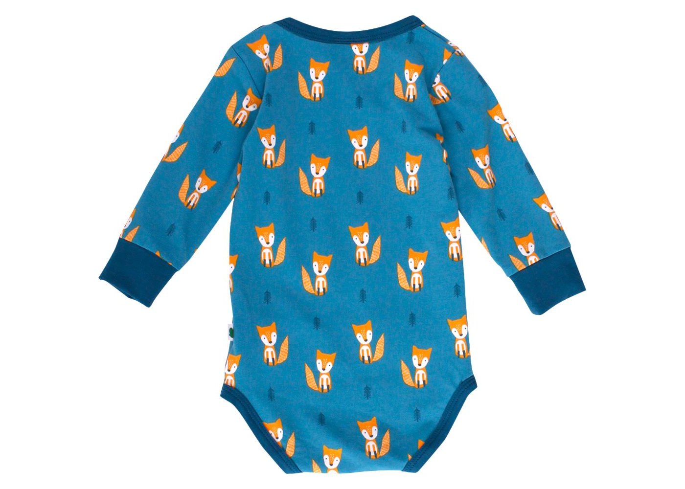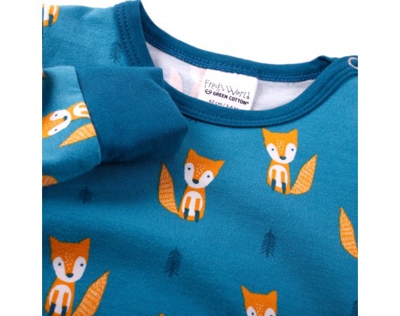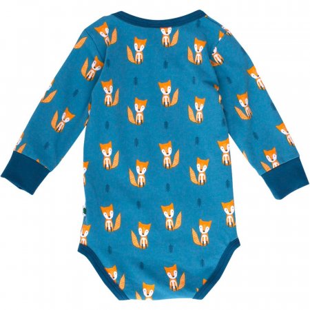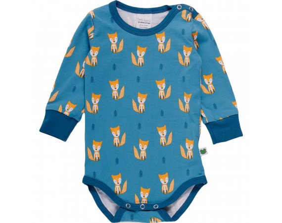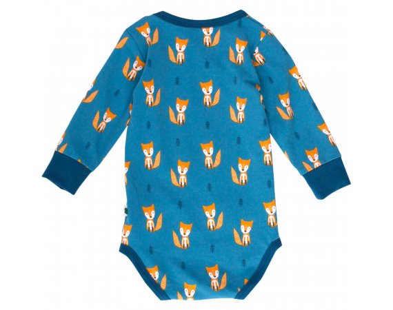 Sød body med ræveprint. Bodyen har fast ribkant i halsudskæring, ved håndled og ben i kontrastfarve. Bodyen lukkes med trykknapper på venstre skulder og imellem ben.