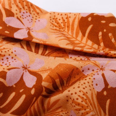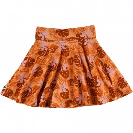Super sød og feminin nederdel med safari print af blade og blomster i brændte farver. Nederdelen har bred, foldbar elastisk talje og er fremstillet i en skøn strækbar bomuldskvalitet. Nederdelen har et flot fald og meget vidde, der gør den meget flot og speciel.