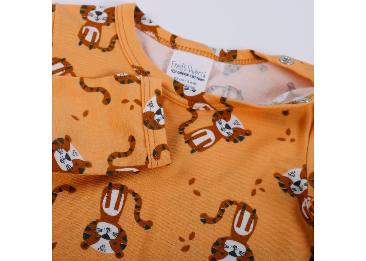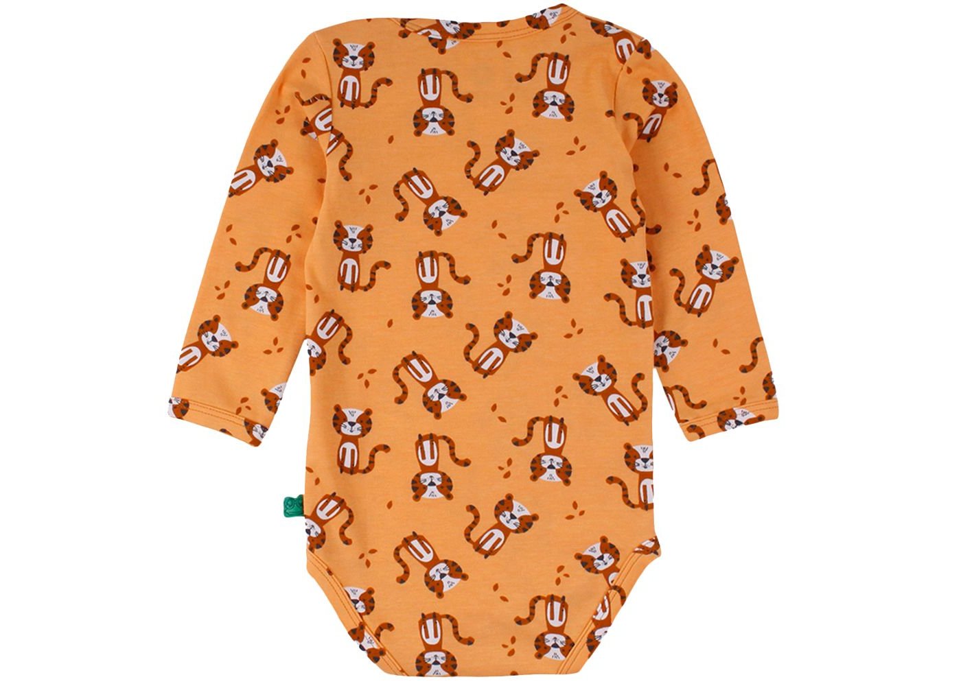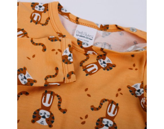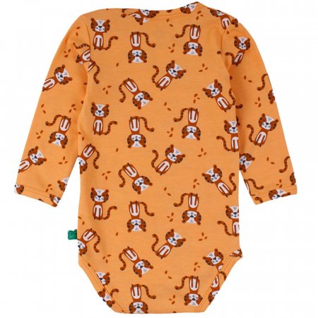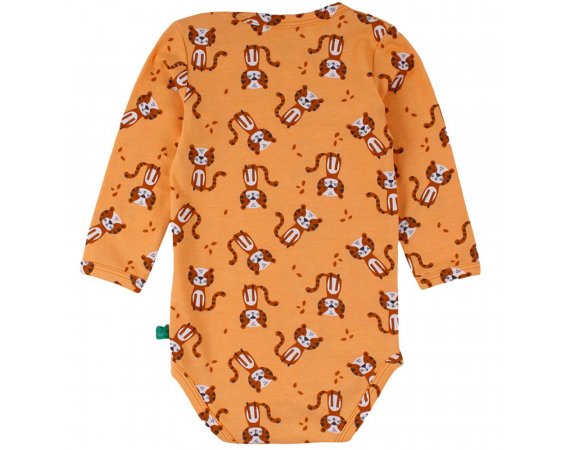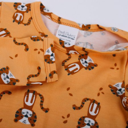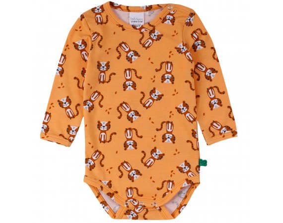 Lækker body med søde bengal tigre i blød strækbar kvalitet. Bodyen har lange ærmer og fast ribkant i halsudskæring, ved håndled og ben. Den lukkes med trykknapper på venstre skulder og imellem ben.