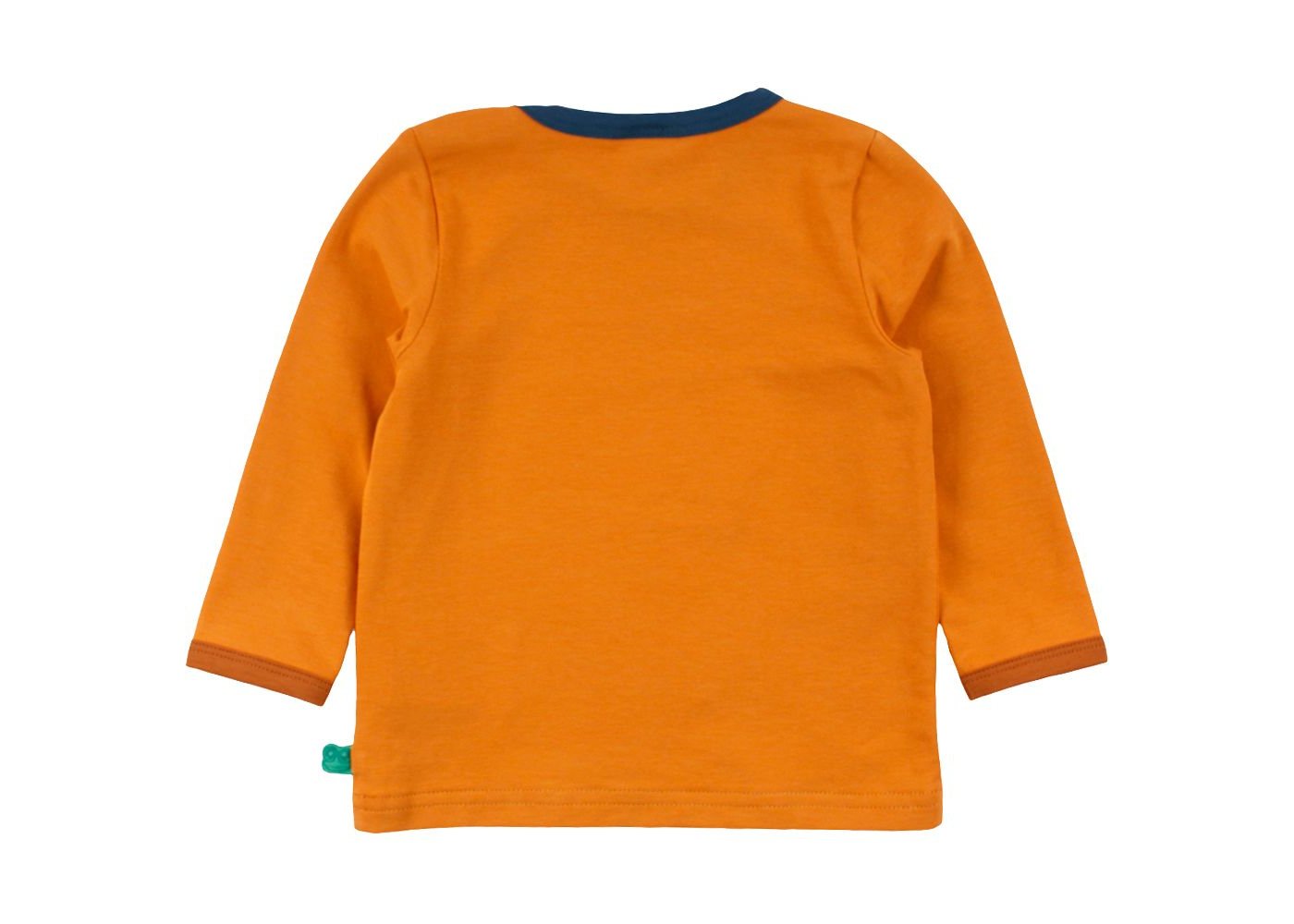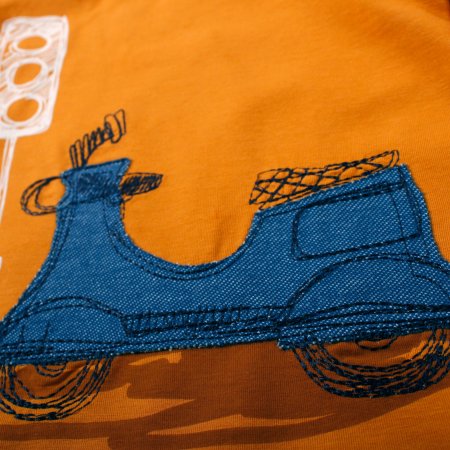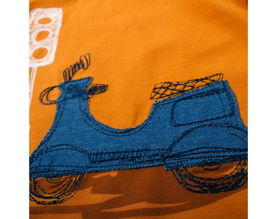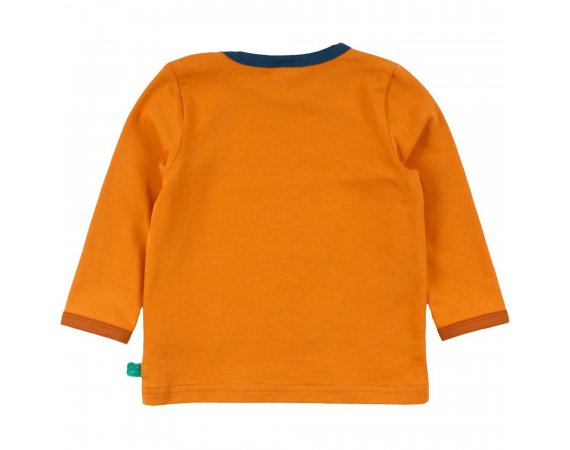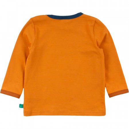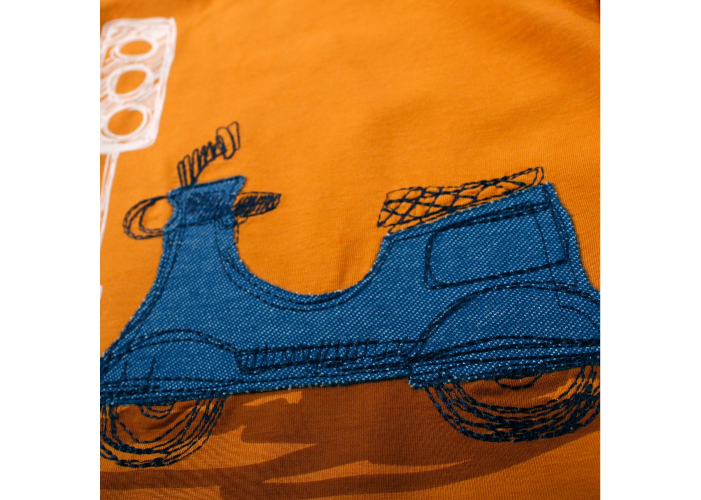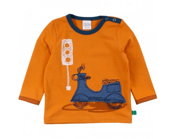 Fin langærmet t-shirt i orange farve med flot scootermotiv. Blusen har blåt kantebånd i halsudskæring og brune ribkanter ved håndled. Den lukkes med trykknapper på venstre skulder og er fremstillet i en lækker, blød og strækbar bomuldskvalitet, der gør den behagelige at have på.Tekstil: 95 % økologisk bomuld, 5 % elastan GOTS Certificeret, som er økologi og miljøhensyn i farvning, strikning, syning og fokus på arbejdsforhold under produktion.