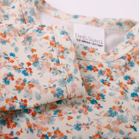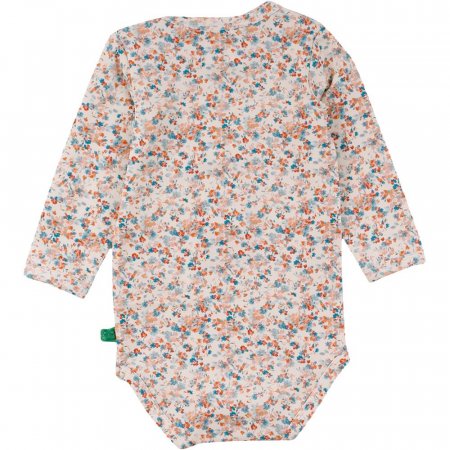 Skøn langærmet body i creme farve med blomster i blå og orange fra Freds World. Bodyen lukkes med trykknapper på venstre skulder og imellem ben. Den er fremstillet i en lækker, blød og strækbar bomuldskvalitet, der gør den behagelig at have på.Tekstil: 95 % økologisk bomuld, 5 % elastan GOTS Certificeret, som er økologi og miljøhensyn i farvning, strikning, syning og fokus på arbejdsforhold under produktion.