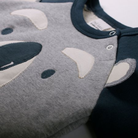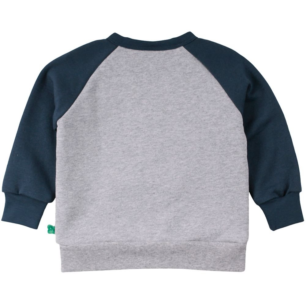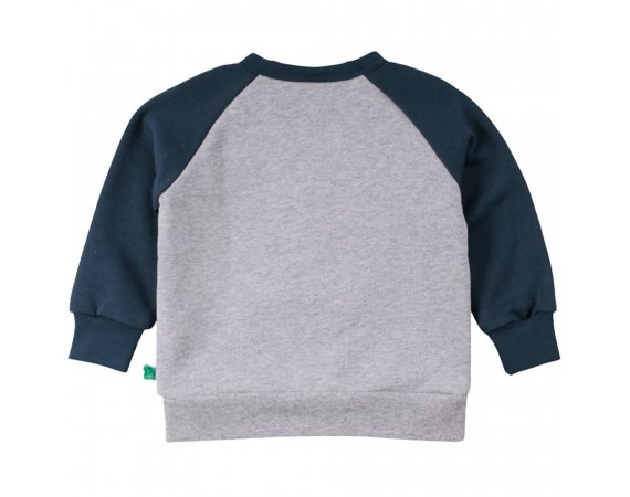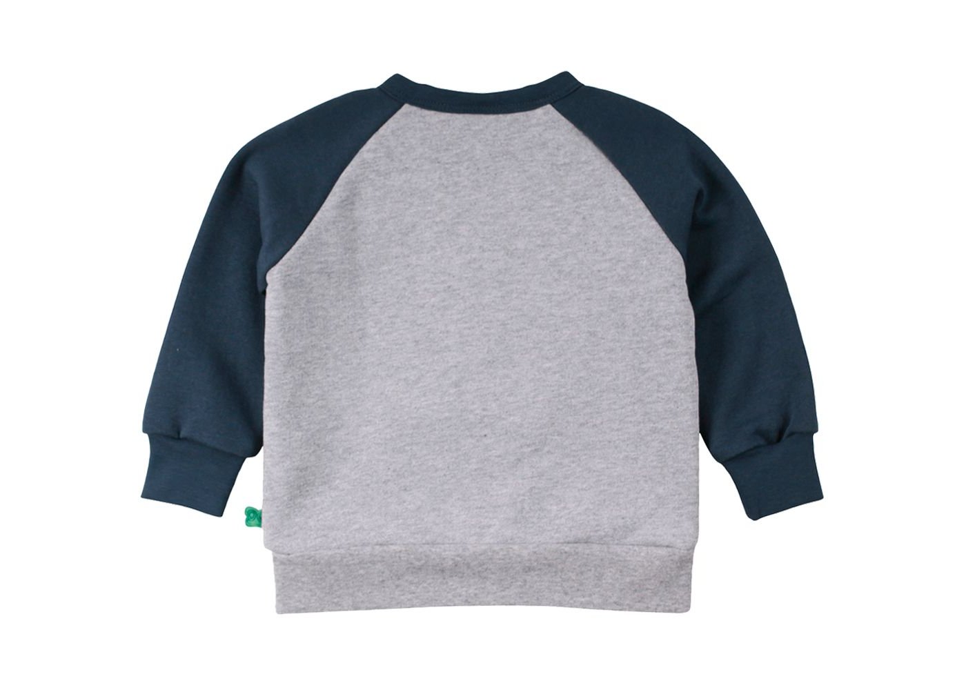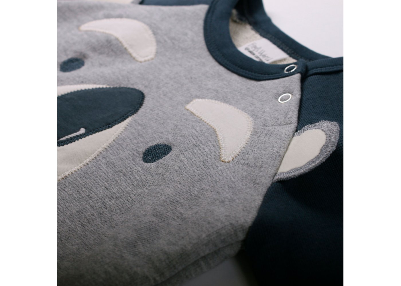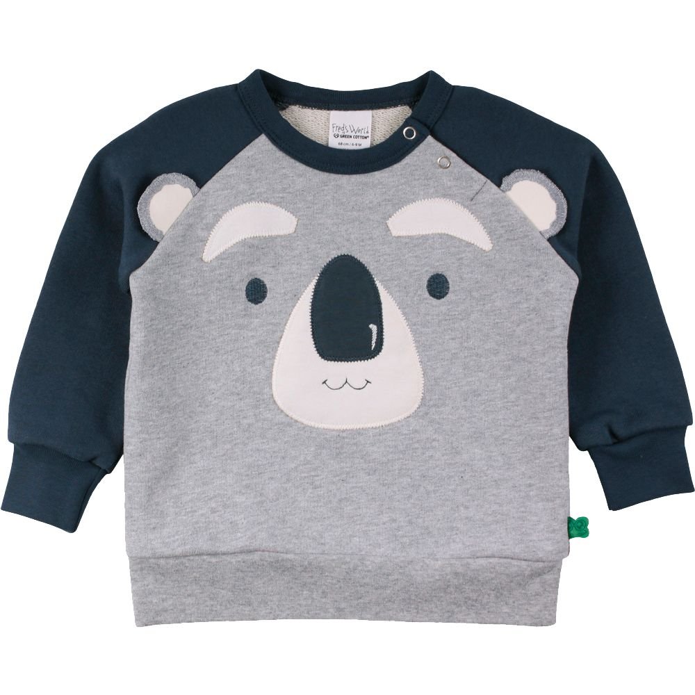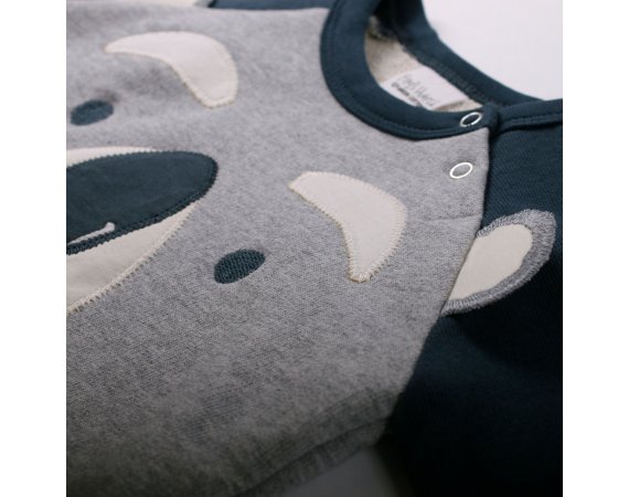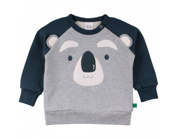 Fin Langærmet sweater med sjovt koala hoved foran. Trøjen er grå med fine blå raglanærmer og en smal rib i halsudskæring. Den har brede ribkanter ved håndled og forneden. Sweateren lukkes med trykknapper på venstre bryst og er fremstillet i en lækker, blød, økologisk bomuld, der gør den behagelige at have på.Tekstil: 100 % økologisk bomuld GOTS Certificeret, som er økologi og miljøhensyn i farvning, strikning, syning og fokus på arbejdsforhold under produktion.
