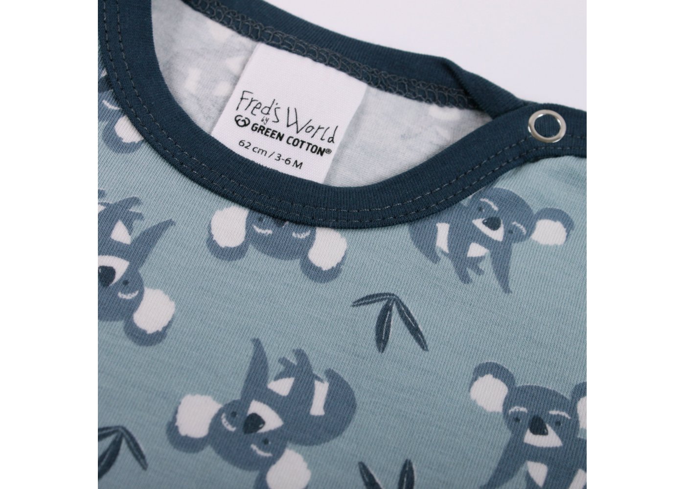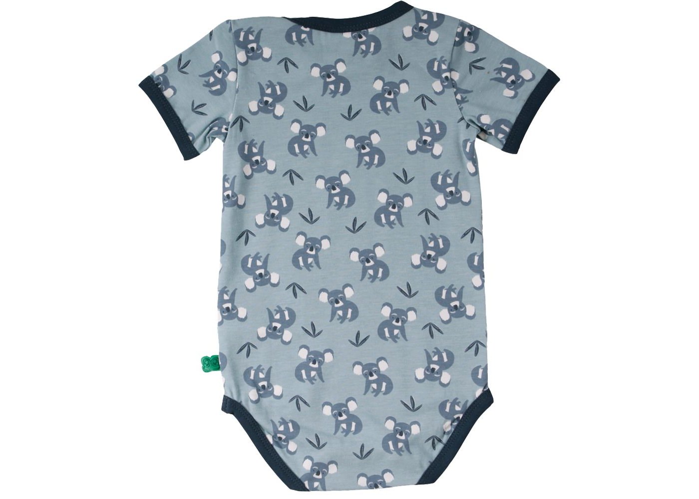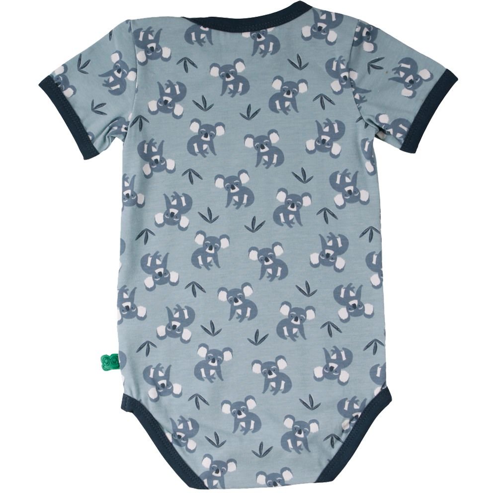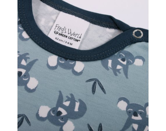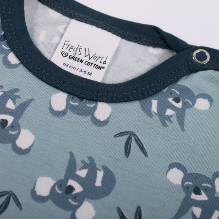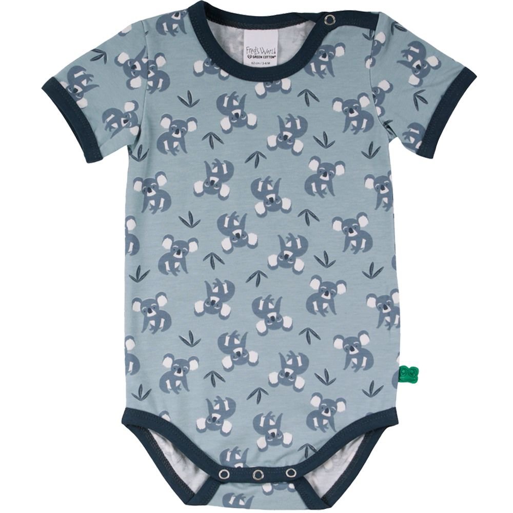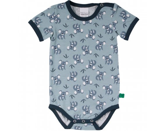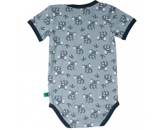 Super sød kortærmet body med koalabjørne fra Freds World. Bodyen har blå ensfarvede ribkanter i alle åbninger og lukkes med trykknapper på venstre skulder og imellem ben. Den er fremstillet i en lækker, blød og strækbar bomuldskvalitet, der gør den behagelig at have på.Tekstil: 95 % økologisk bomuld, 5 % elastan GOTS Certificeret, som er økologi og miljøhensyn i farvning, strikning, syning og fokus på arbejdsforhold under produktion.