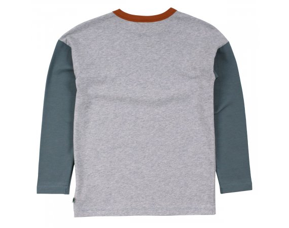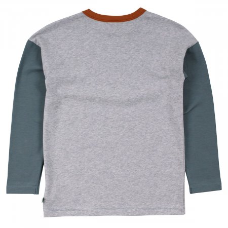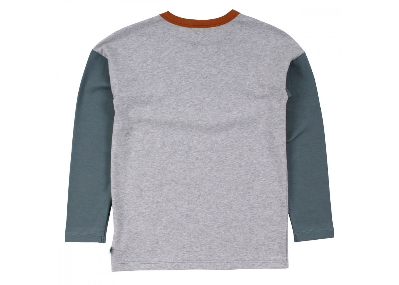 Blusen er i grå med gråblå ærmer og har fint brunt kantbånd i halsudskæring.