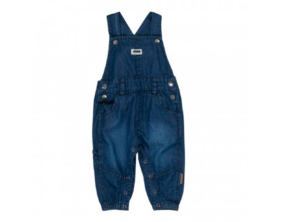 Overalls i denimkvalitet med knappelukning mellem benene og elastik i siden og bagtil.