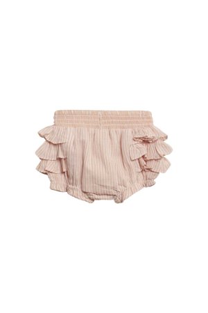 Shorts with elastic at the waist and by the legs. The shorts have three ruffled layers on each side and a cute bow by the front of the smock elastic at the waist.