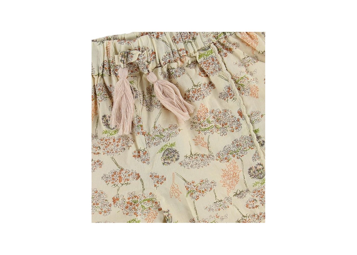 Shortsene har en bred elastikkant i livet, foran et praktisk bindebånd med søde kvaster, og en smal blondekant ned langs siderne.