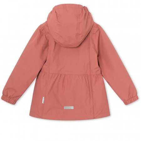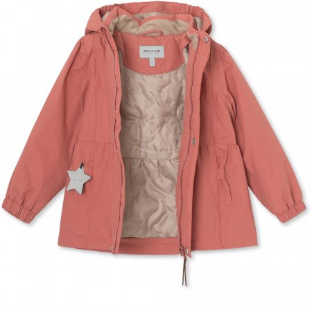 Sød sommerjakke fra MINI A TURE fremstillet i genanvendt nylon, et åndbart og slidstærkt materiale. Jakken har ekstra vidde i skørt og pipings både for og bag. Hætten har trykknapper og er aftagelig. De sløjfe-formede lommer giver jakken et ekstra feminint look. Jakken er vatteret, hvilket vil sige, at der ligger et tyndt lag polyester-fyld imellem ydre stof og foer, som giver ekstra varme og komfort. Jakken er imprægneret med bionic Finish ECO - flourine free (PFC) coating, som gør den vand og smudsafvisende.
