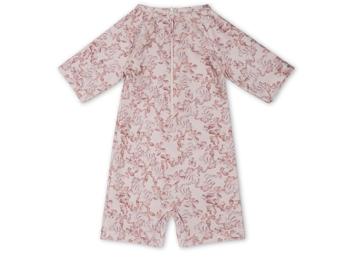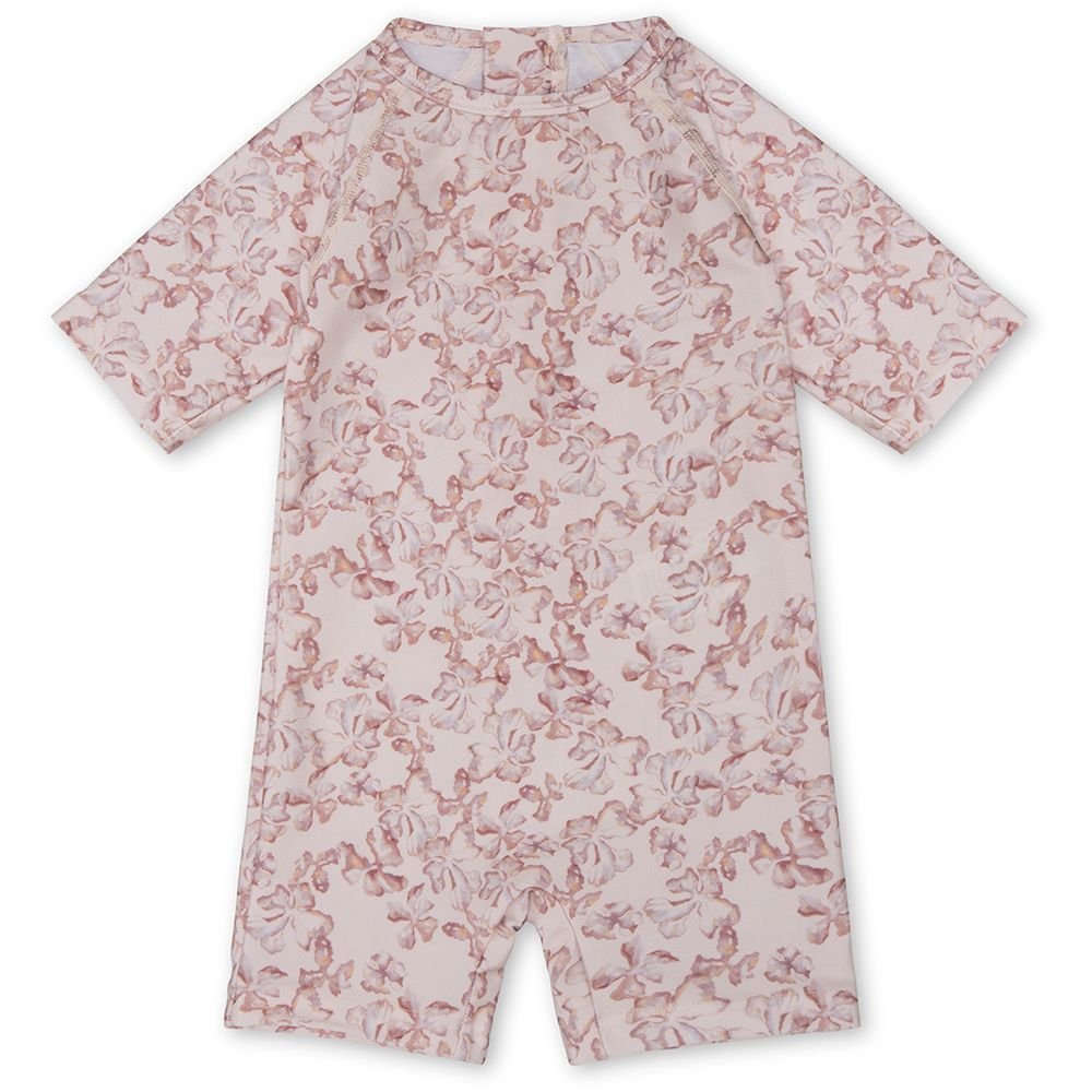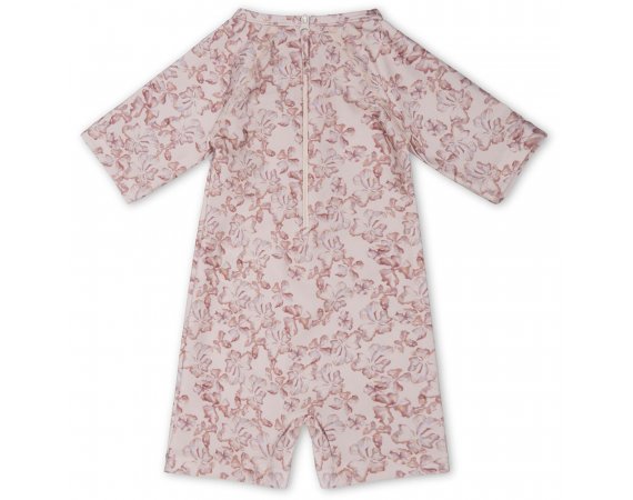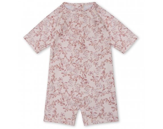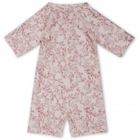Yndig bade-heldragt med flot rosa blomsterprint fra MINI A TURE. Badedragt med korte ærmer og ben, der lukkes med YKK lynlås bagpå. Den er fremstillet af et strækbart materiale, har solfaktor UV50 beskyttelse og er lavet i genanvendt polyester, der er fremstillet af opsamlet plast fra verdenshavene.